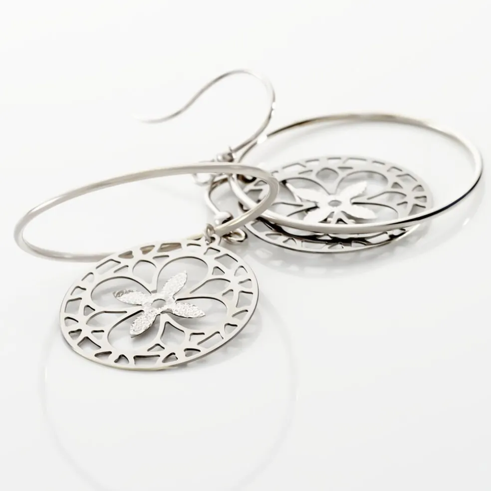 Boucles D’oreilles Pendantes Or Blanc 375/1000 Double Cercles Avec Motif Trefles Ajoures