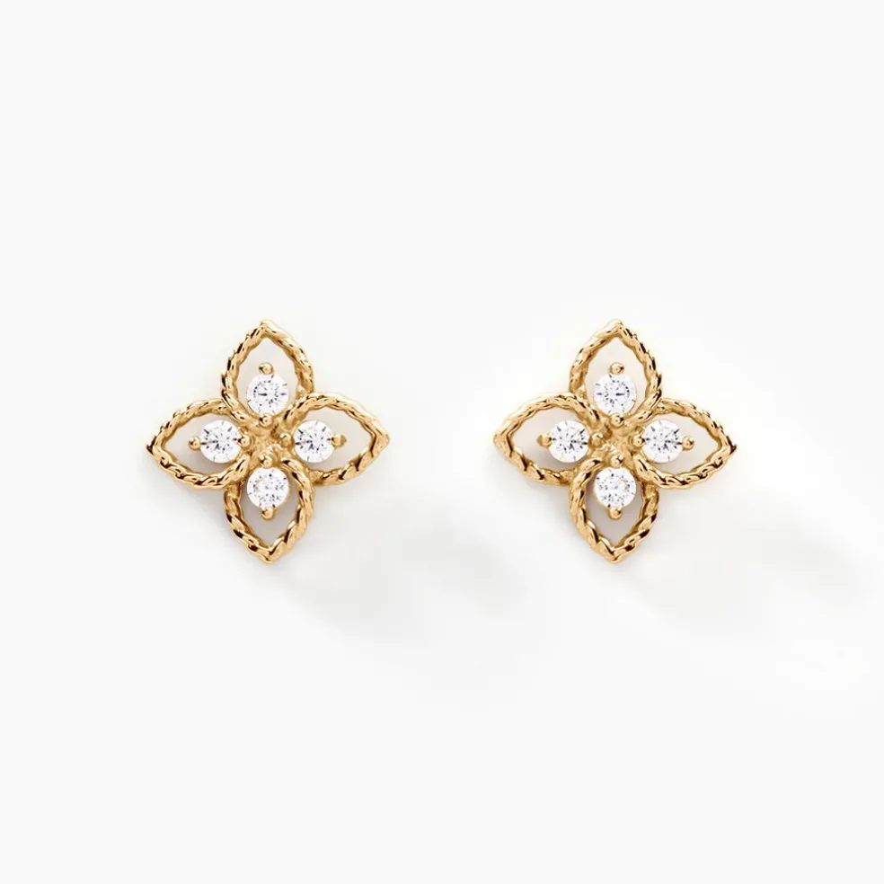 Boucles D’oreilles Puces Or Jaune 375/1000 Fleurs Oxydes De Zirconium Effet Perle