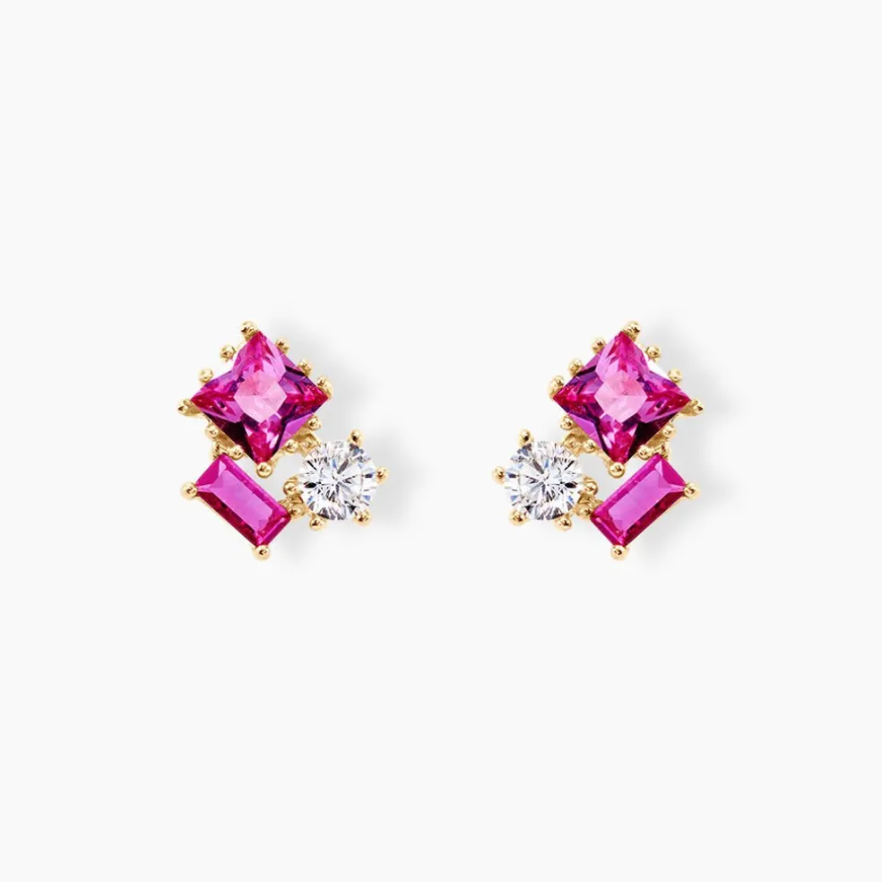 Boucles D’oreilles Puces Or Jaune 375/1000 Jardin D’oxyde De Zirconium Multicouleur