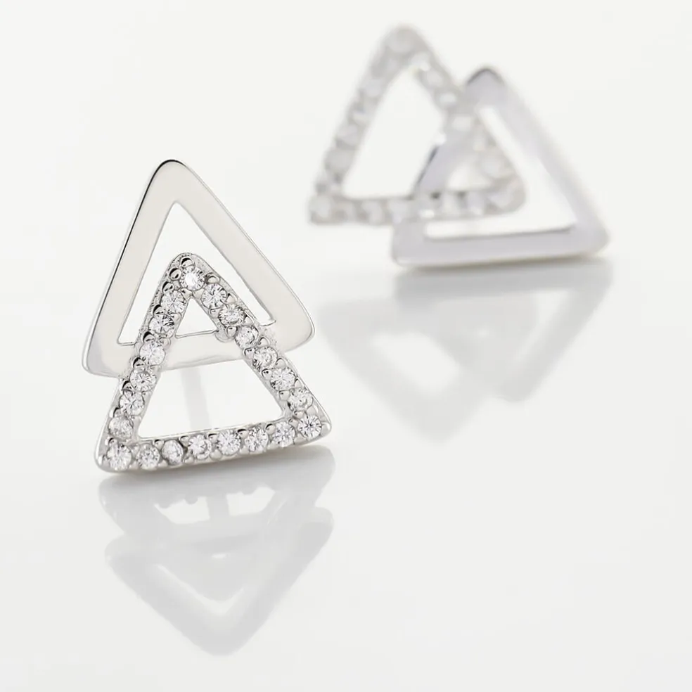 Boucles D’oreilles Puces Argent Blanc 925/1000 Triangles Ajoures Semi Pavage Oxydes De Zirconium