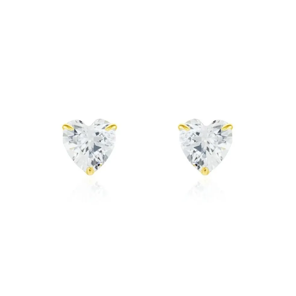 Boucles D’oreilles Puces Or Jaune 375/1000 Coeur Oxyde De Zirconium Serti 4 Griffes 5mm