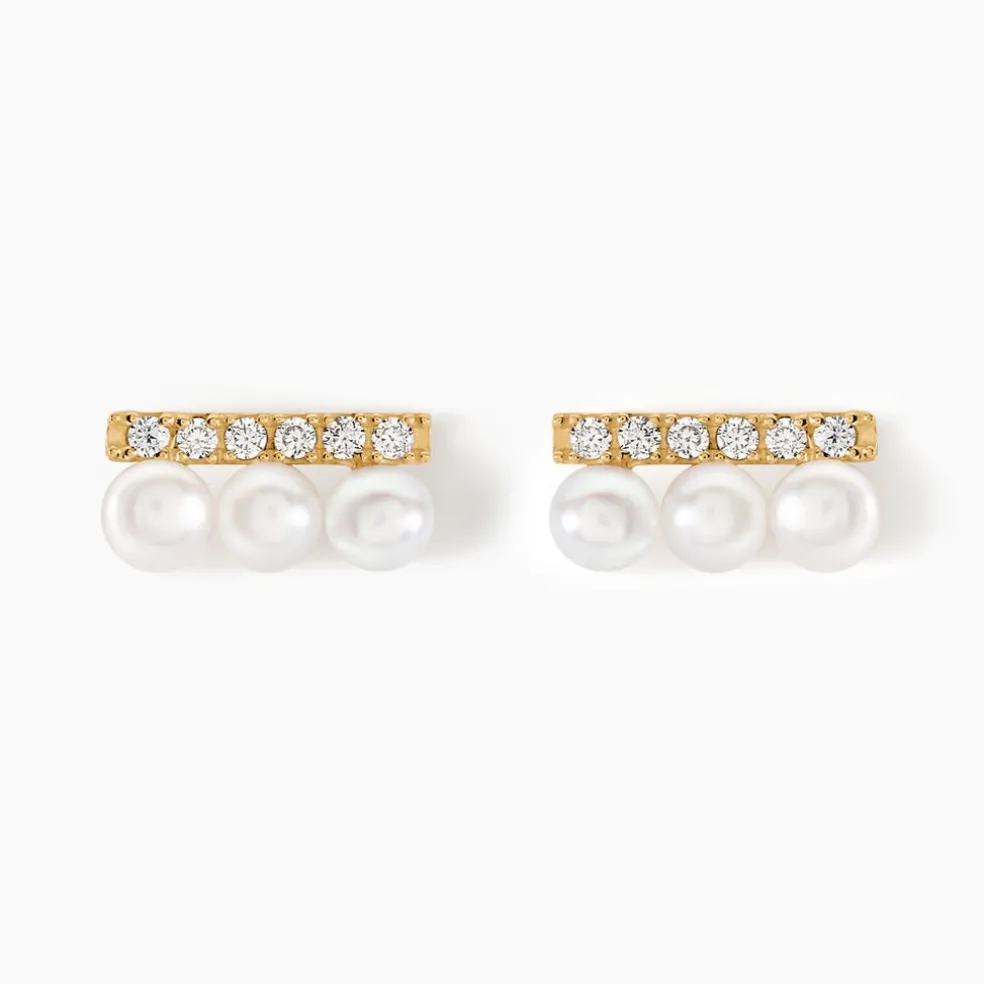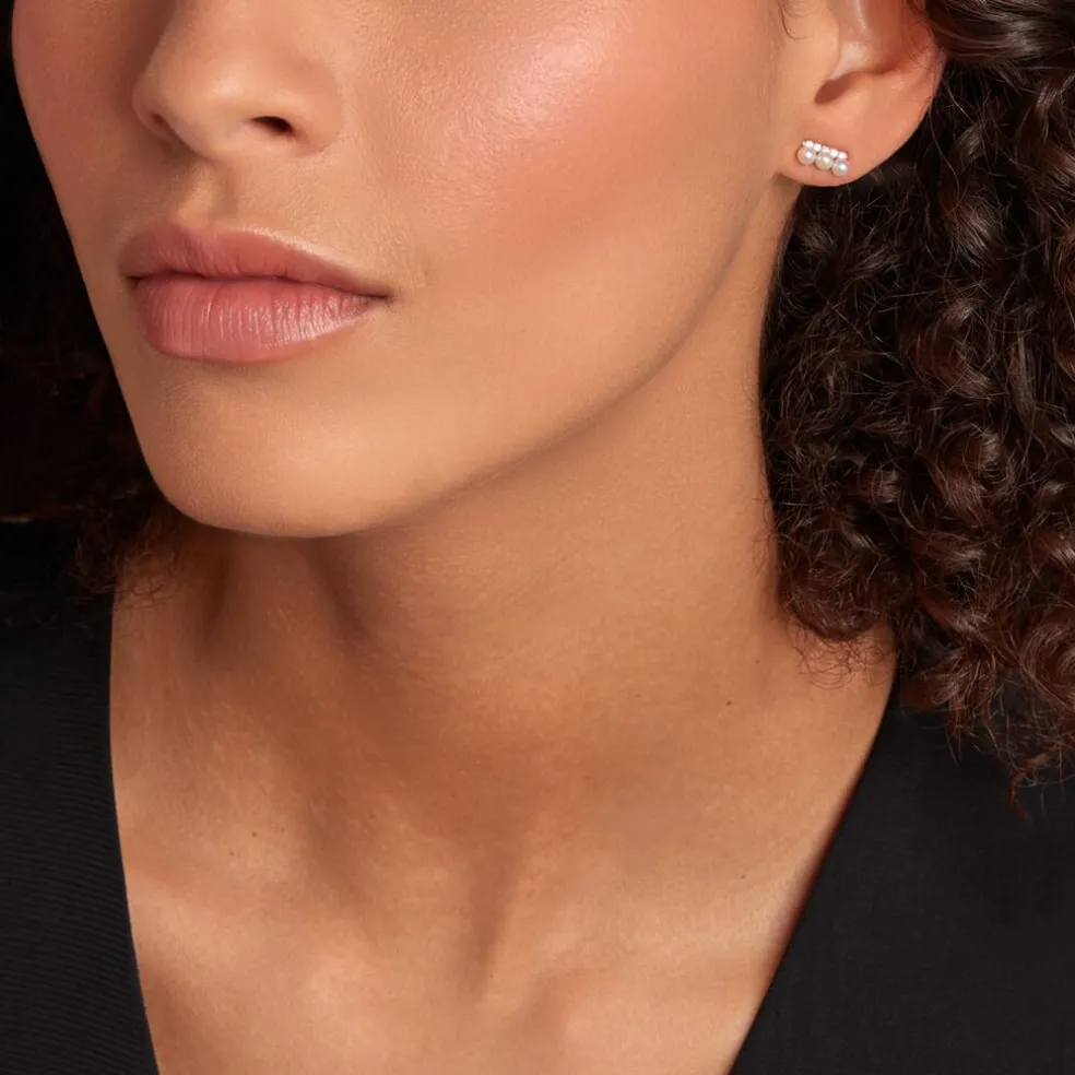 Boucles D’oreilles Puces Or Jaune 375/1000 3 Perles De Culture Blanches Et Barre Oxydes De Zirconium Serti Griffes