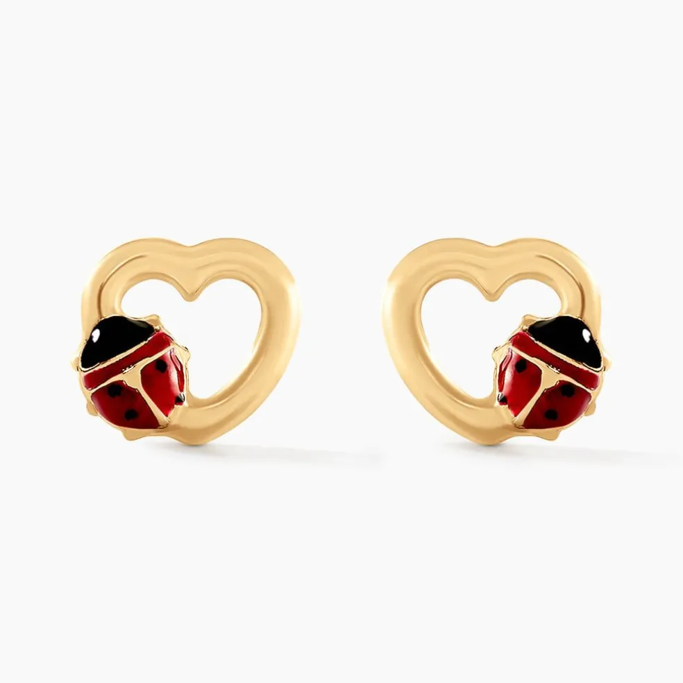 Boucles D’oreilles Puces Or Jaune 375/1000 Coeurs Et Coccinelles Smalto Rouge