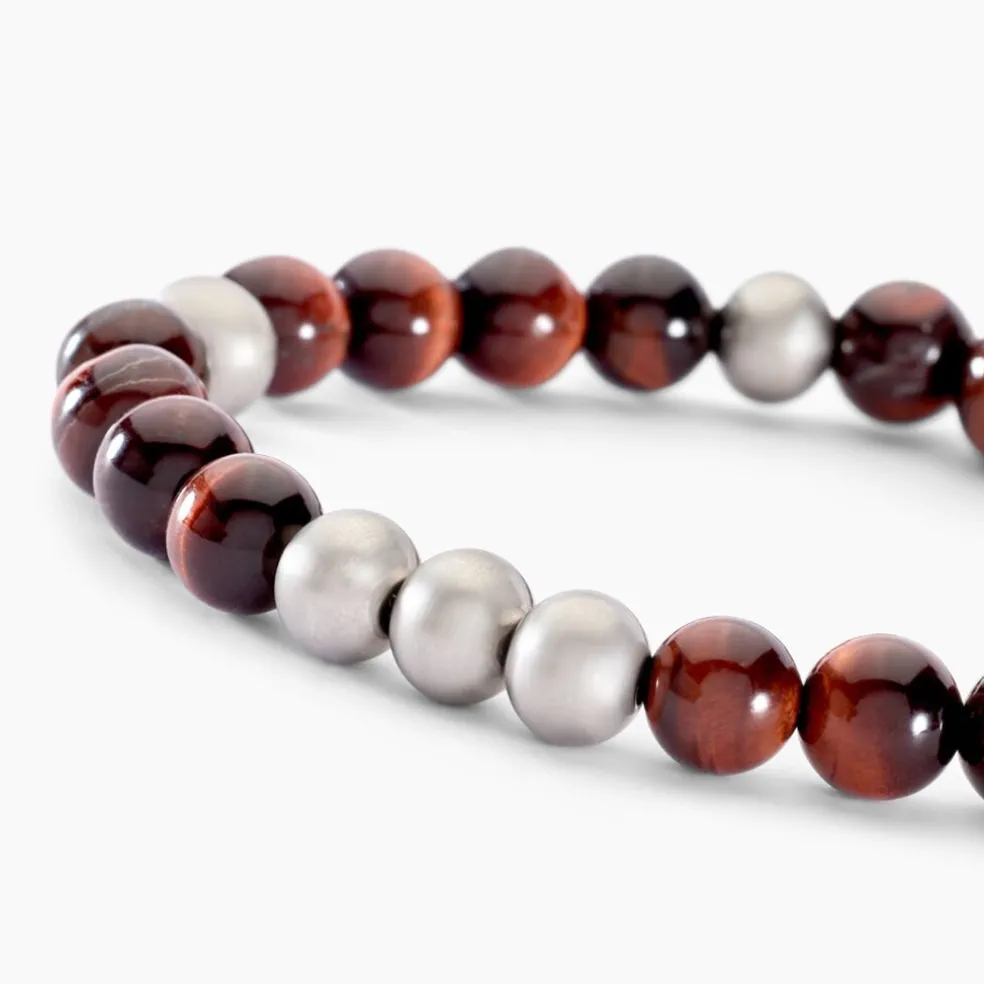 Bracelet Acier Inoxydable Blanc Boules Oeil De Tigre Marron Et Acier Blanc 21cm