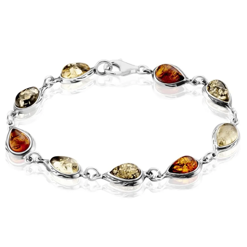 Bracelet Argent Blanc 925/1000 Ambres Poires Multicolores Vert/miel/cognac 18cm