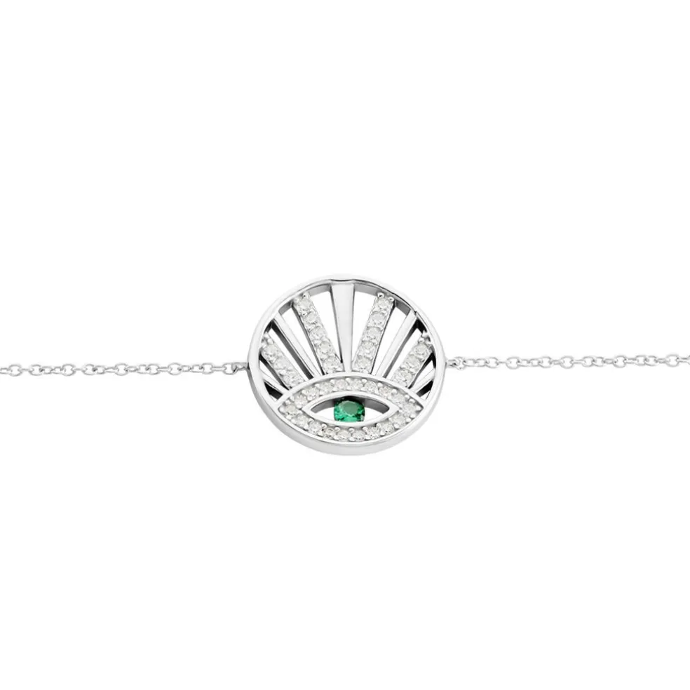 Bracelet Argent Blanc 925/1000 Pastille Oeil Sertis Griffes Oxydes De Zirconium Blancs Et Verts Maille Forçat 19cm