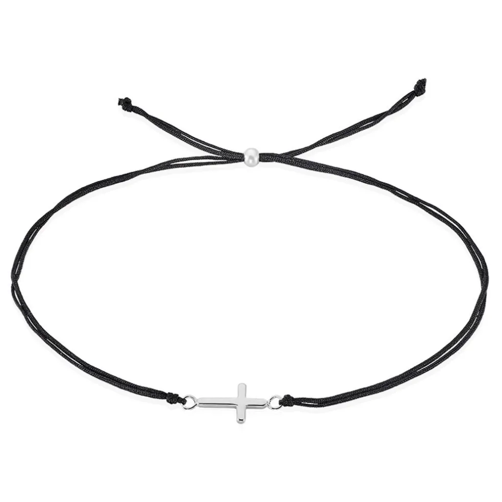 Bracelet Argent Blanc 925/1000 Croix Cordon Noir Ajustable 20cm
