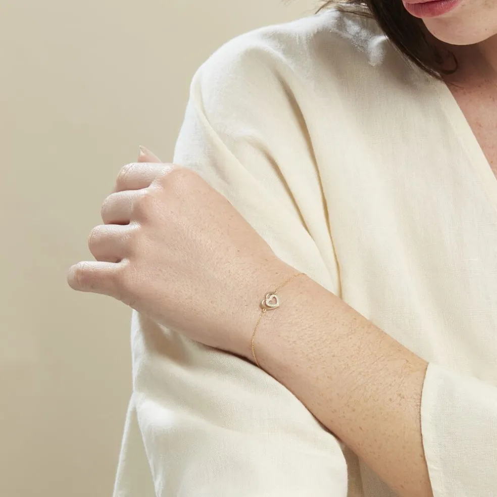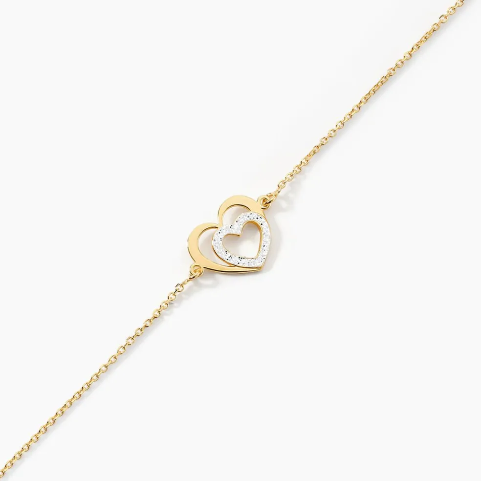 Bracelet Or Jaune 375/1000 Double C艙urs Avec Un C艙ur Glitter Argente Maille Jaseron 16+2cm