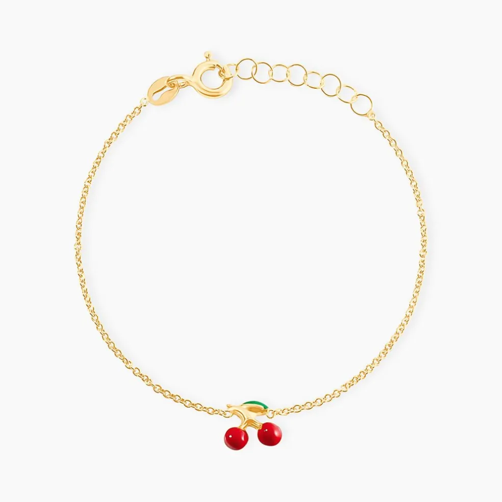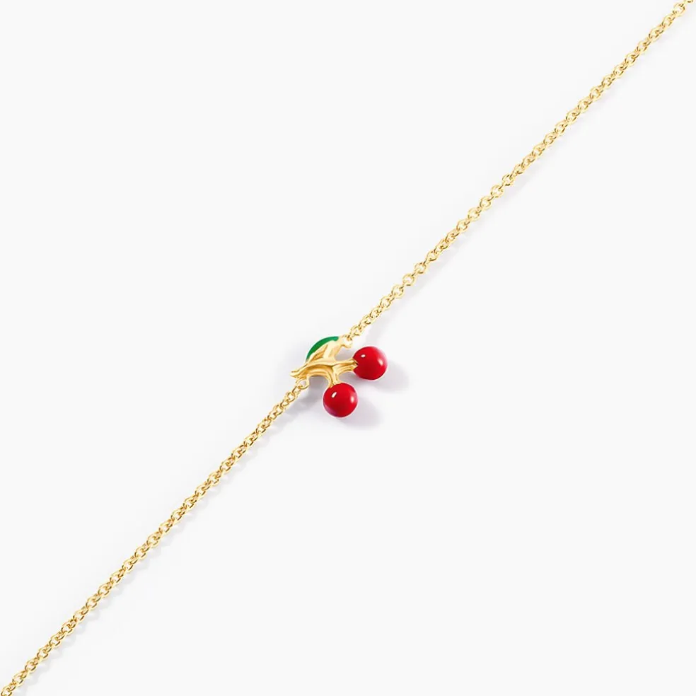 Bracelet Or Jaune 375/1000 Maille Forçat Cerise Smalto Vert Et Rouge 14cm