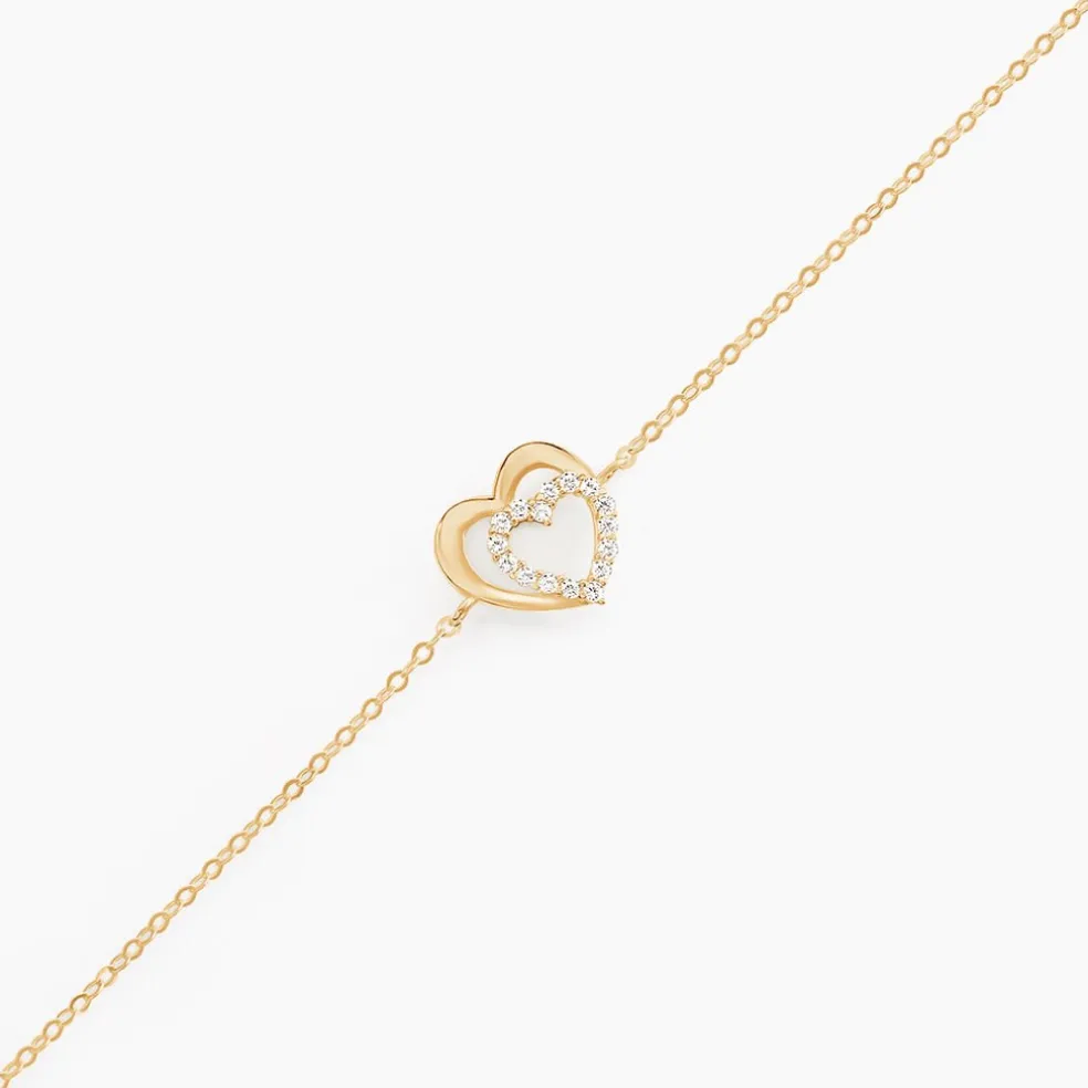 Bracelet Or Jaune 375/1000 Double C艙urs Pavage Oxydes De Zirconium 18cm