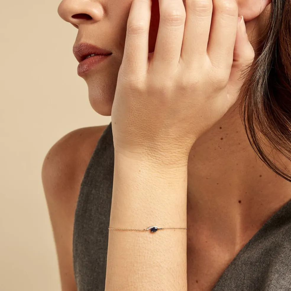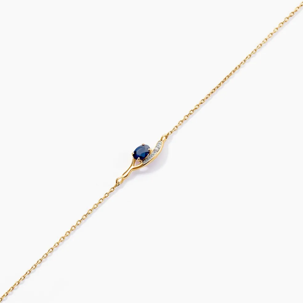 Bracelet Or Jaune 375/1000 Saphir Ovale 0.23cts Et Diamant Sertis Griffes Maille Forcat 16+2cm