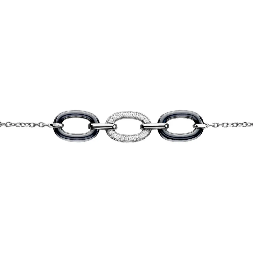 Bracelet Argent Blanc 925/1000 Deux Maillons Ceramiques Noires Un Maillon Pavage Oxydes De Zirconium 19cm