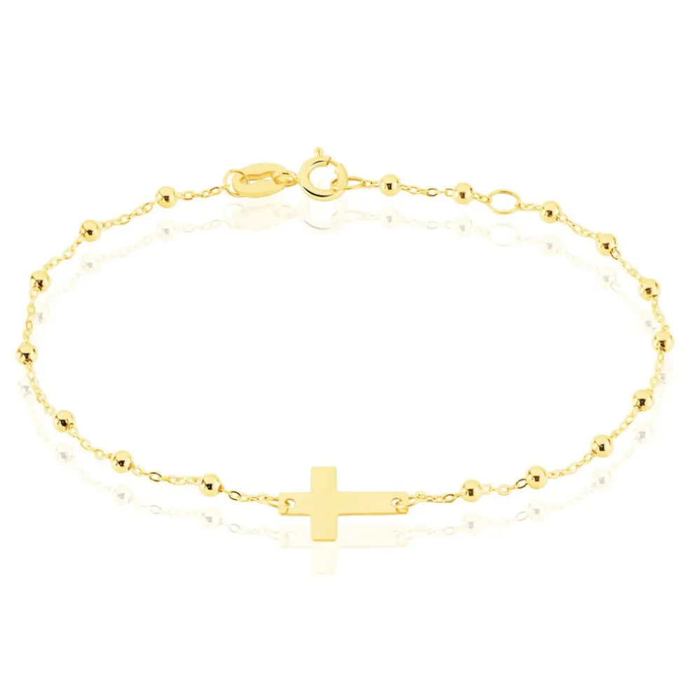 Bracelet Or Jaune 375/1000 Motif Croix Maille Boule 14cm