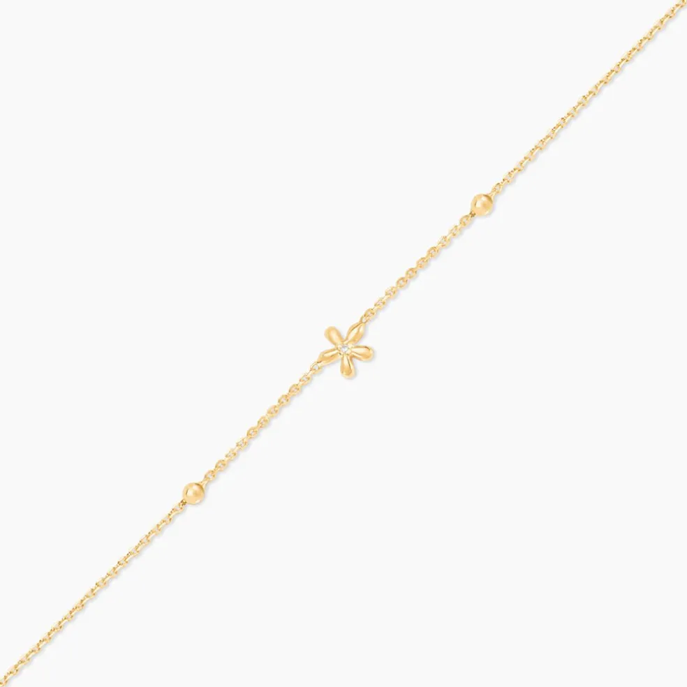 Bracelet Or Jaune 375/1000 Fleur Oxyde De Zirconium Et Boules Maille Jaseron 14+2cm