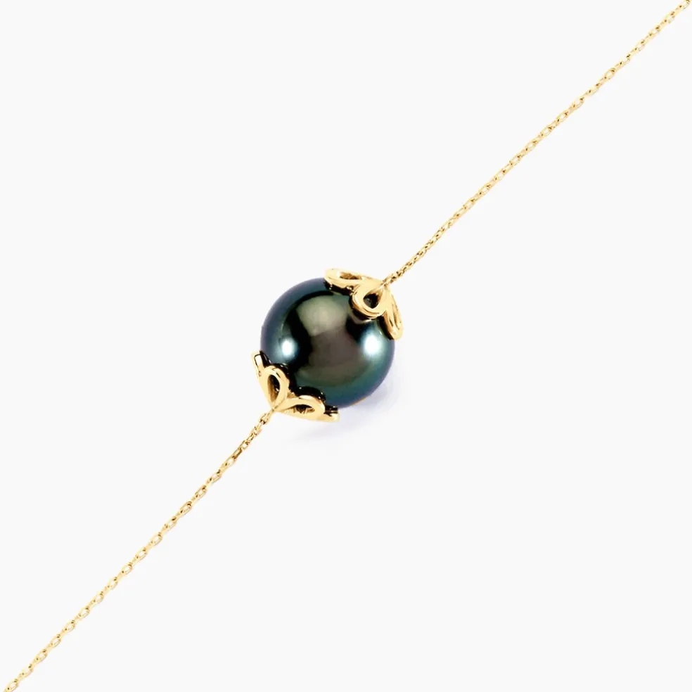 Bracelet Or Jaune 375/1000 Perle De Culture De Tahiti 9/9.5mm Ronde Motif Floral Ajoure 20cm