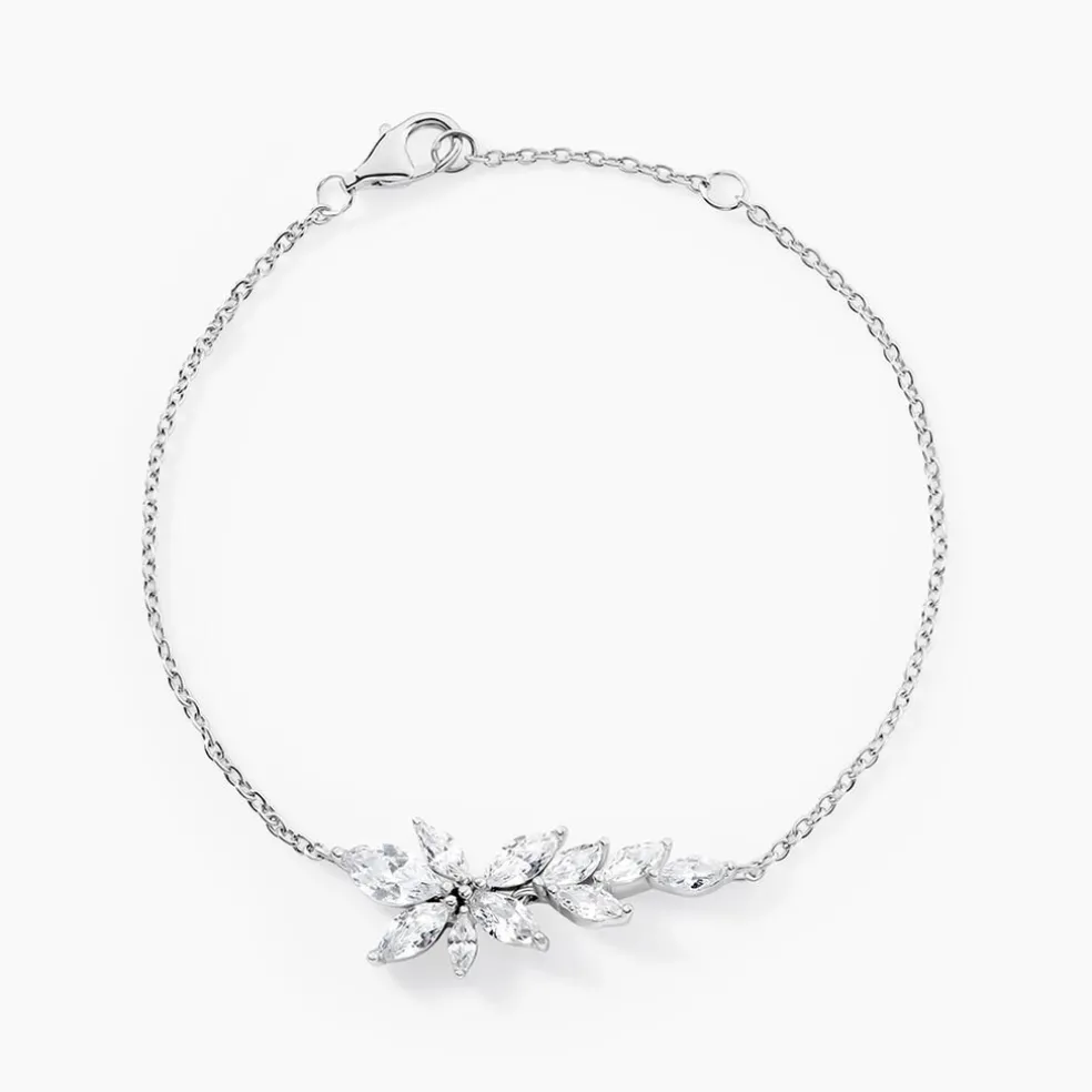 Bracelet Argent Blanc 925/1000 Fleur Oxydes De Zirconium Taille Navette Maille Jaseron 16+2Cm
