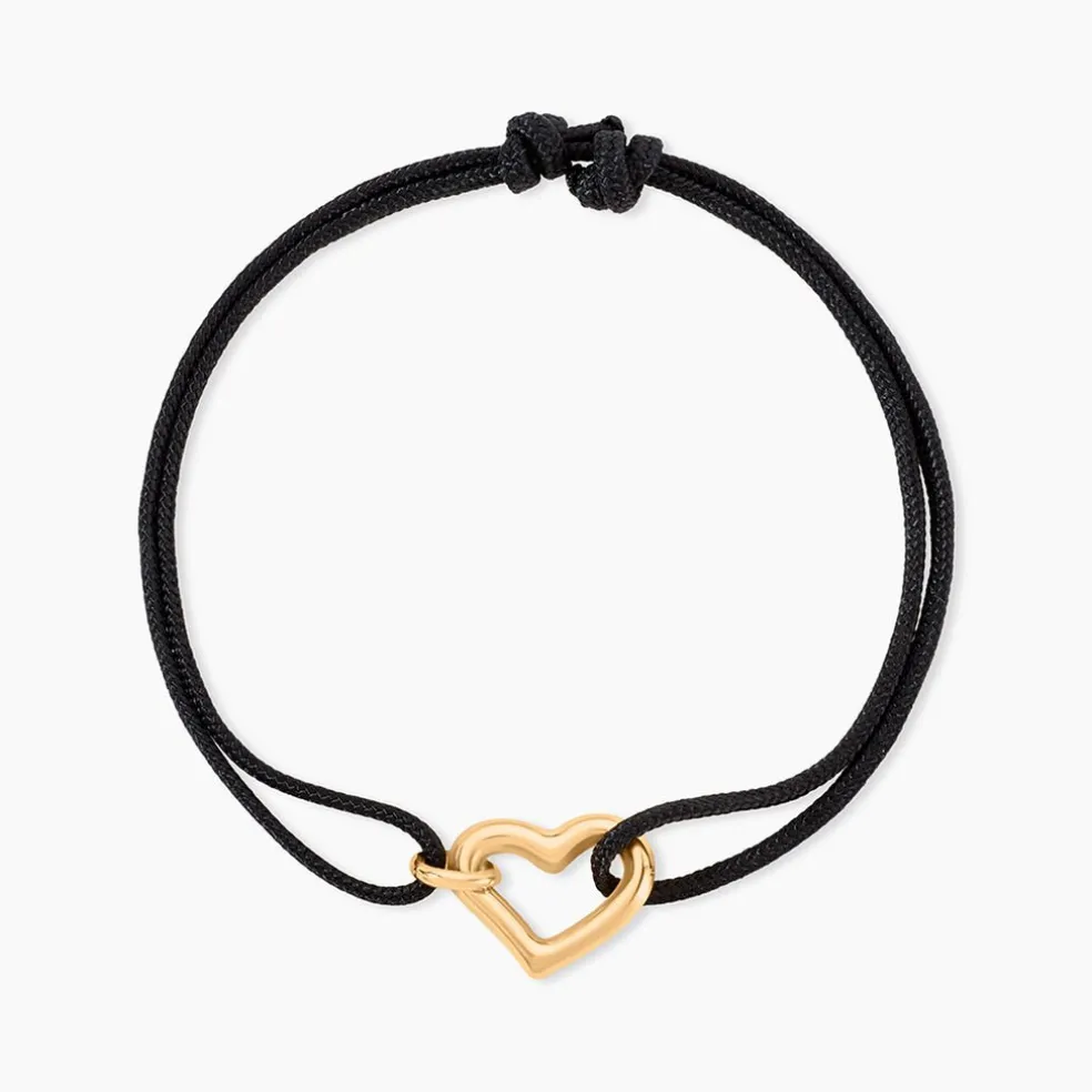 Bracelet Or Jaune 375/1000 Coeur Cordon Coton Noir Ajustable