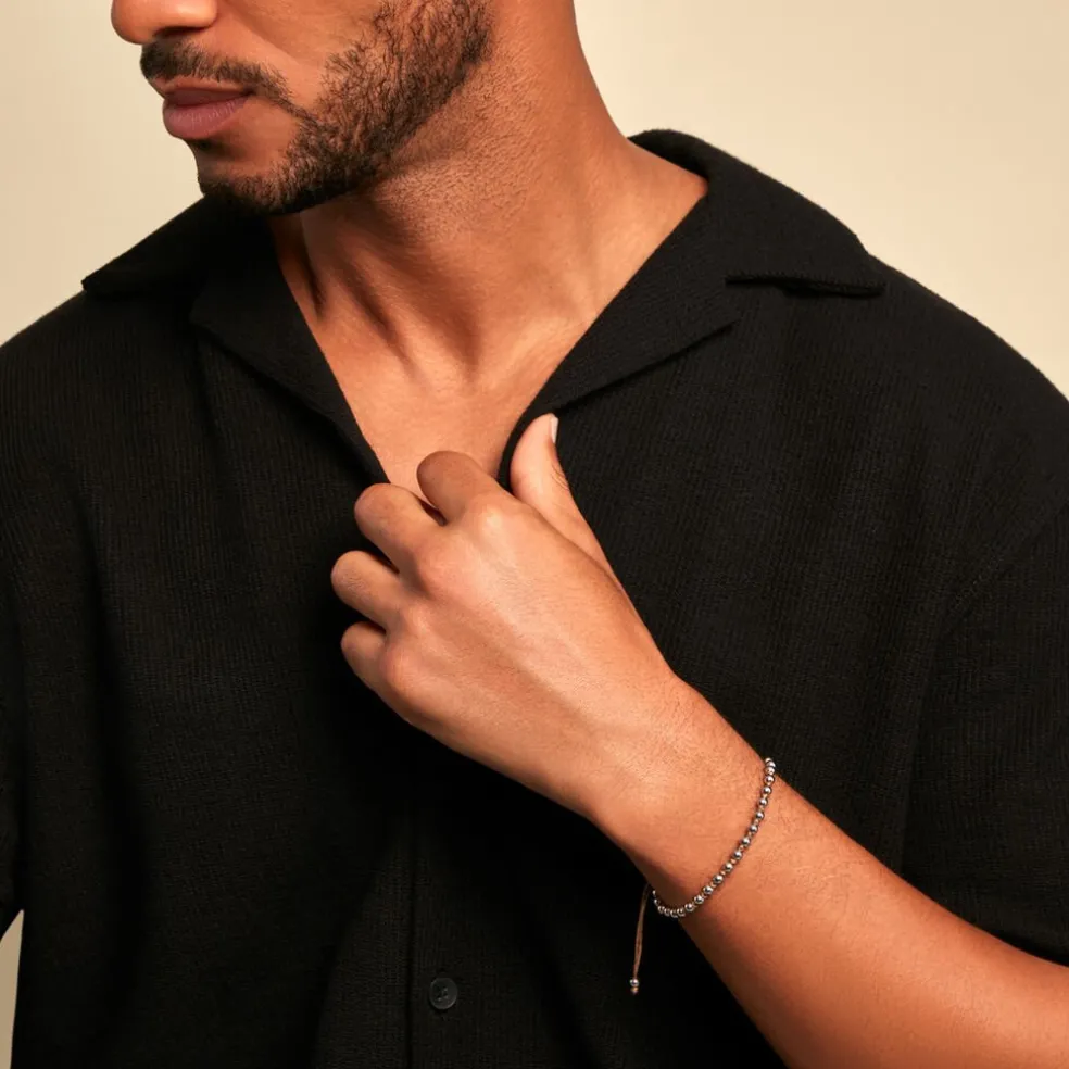 Bracelet Acier Inoxydable Blanc Boules Et Cordon Nylon Marron 18-27Cm