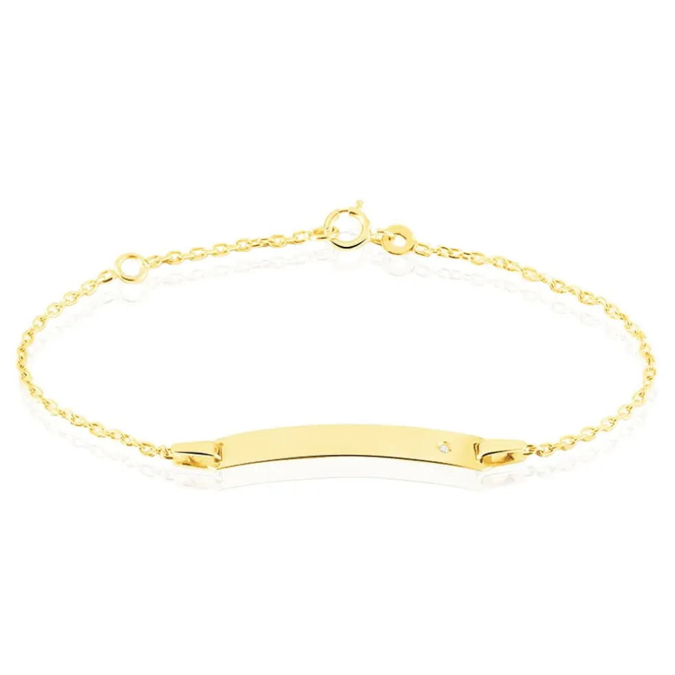 Bracelet Identité Bebe Or Jaune 375/1000 Plaque Rectangle Maille Forçat Oxyde De Zirconium 14cm