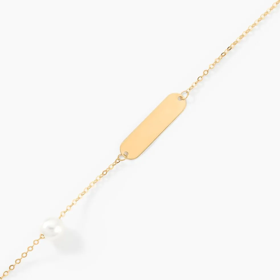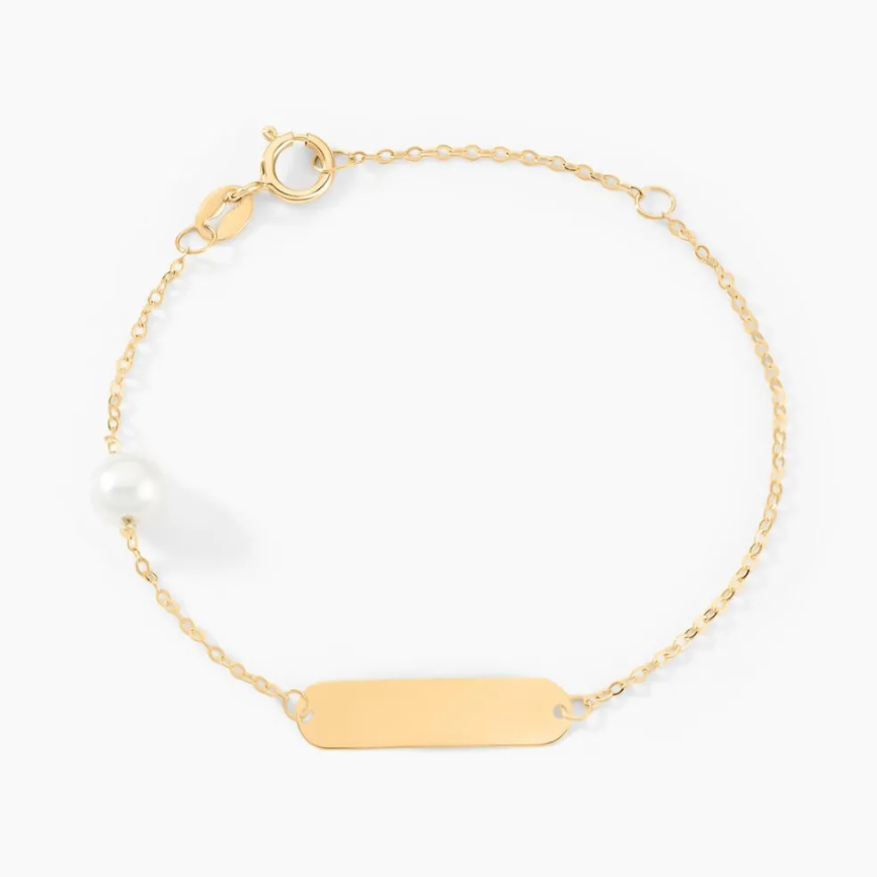 Bracelet Identité Bebe Or Jaune 375/1000 Plaque Rectangle Et Perle De Culture 14cm