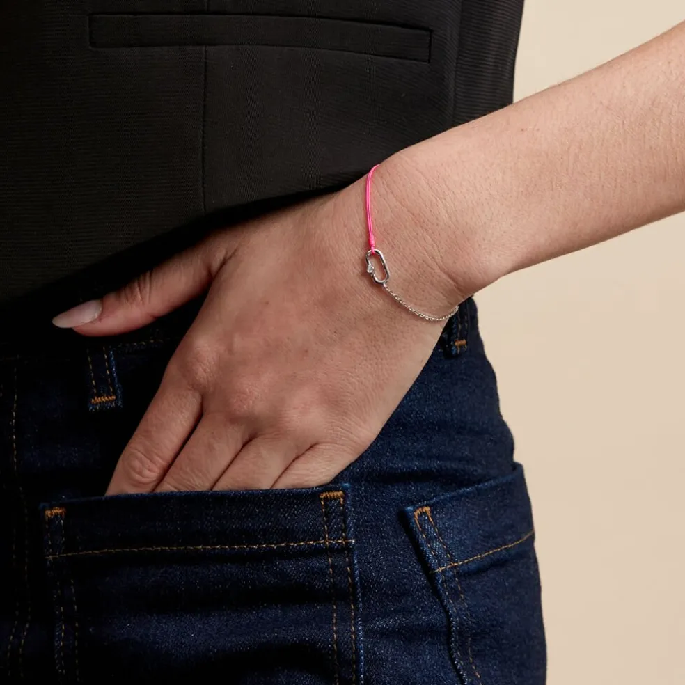 Bracelet Argent Blanc 925/1000 Maillon Ovale Oxyde De Zirconium Serti Clos Cordon Rose Et Maille Jaseon 16+3cm
