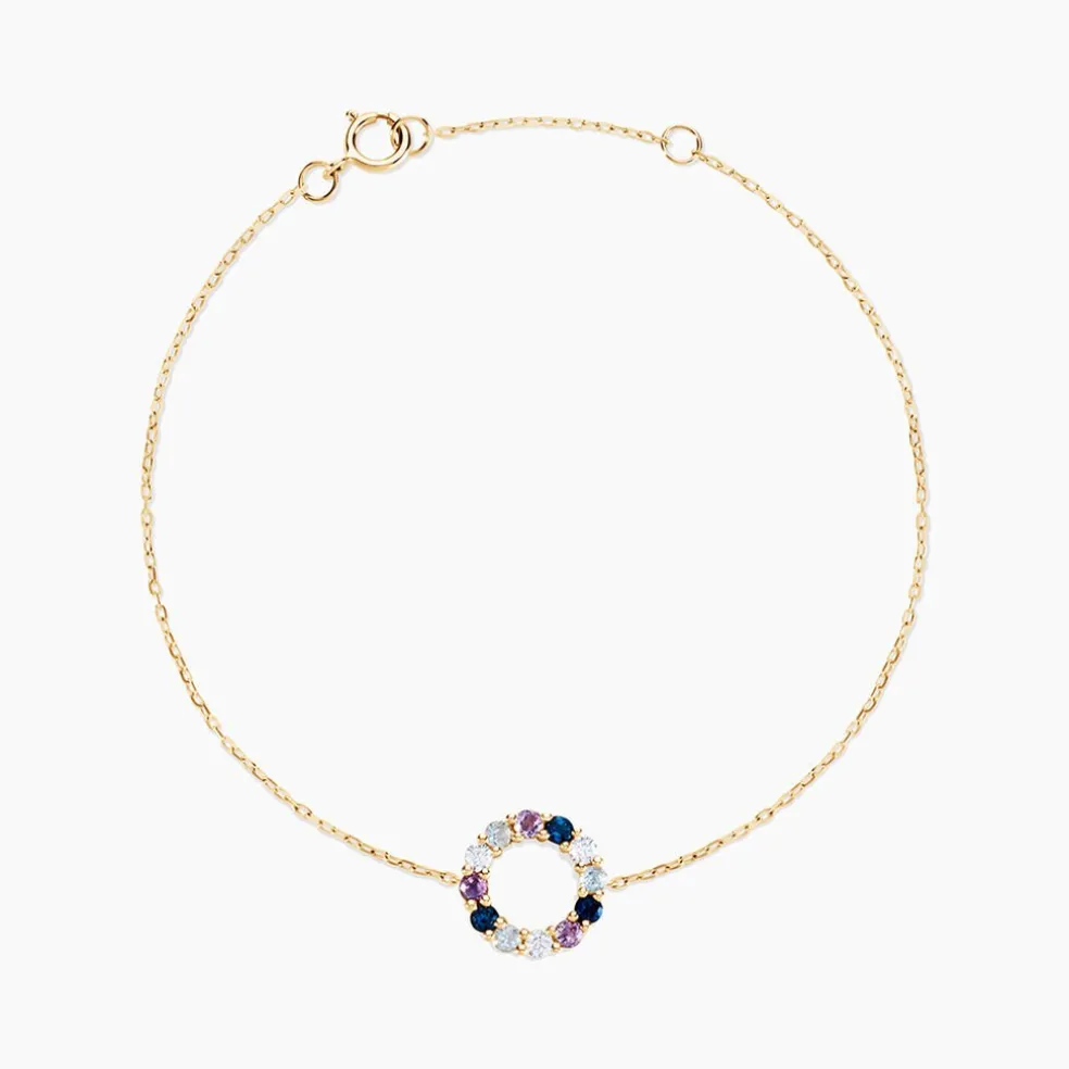 Bracelet Or Jaune 375/1000 Cercle Ajoure Amethyste Topaze Oxyde De Zirconium Serti Griffe Maille Forcat Ronde 16+2cm
