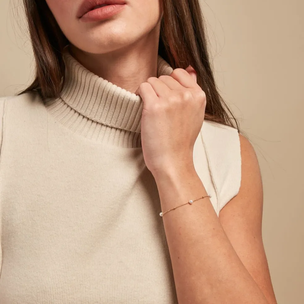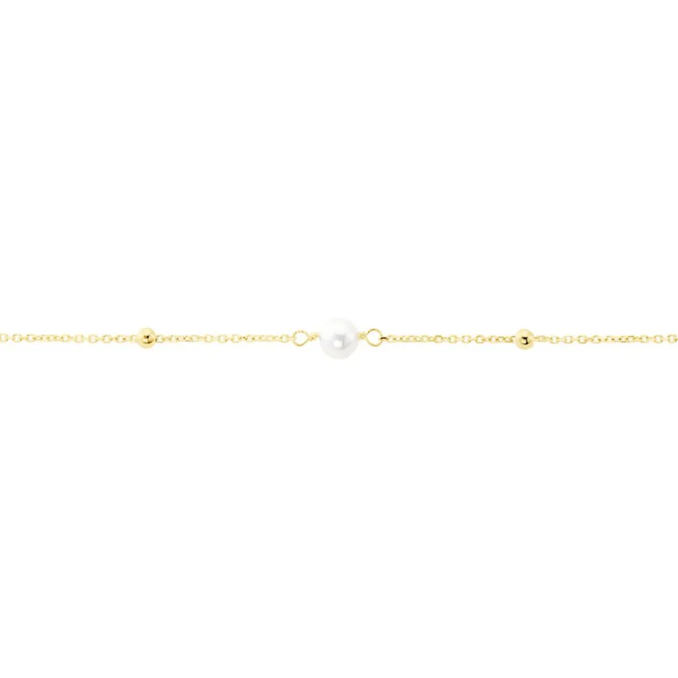 Bracelet Or Jaune 375/1000 3 Perles De Culture Rondes Blanches 3.5/4mm Alternees 4 Boules Lisses Maille Forcat 16+2cm
