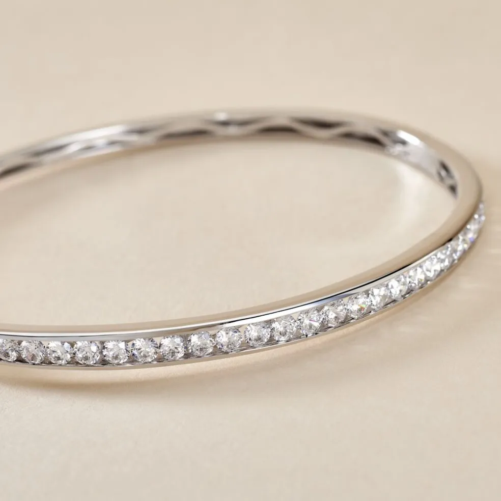 Bracelet Jonc Or Blanc 375/1000 Oxydes De Zirconium Sertis Rails 4mm Diam 52x60mm