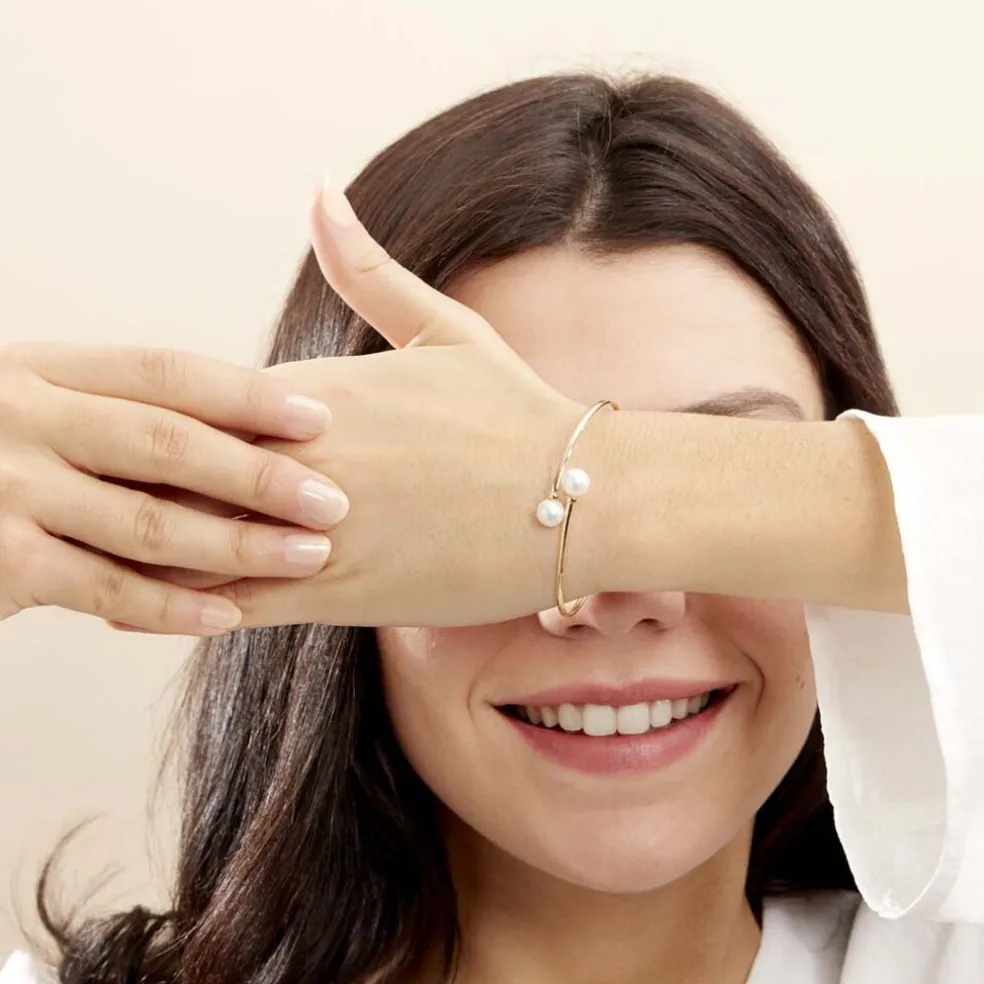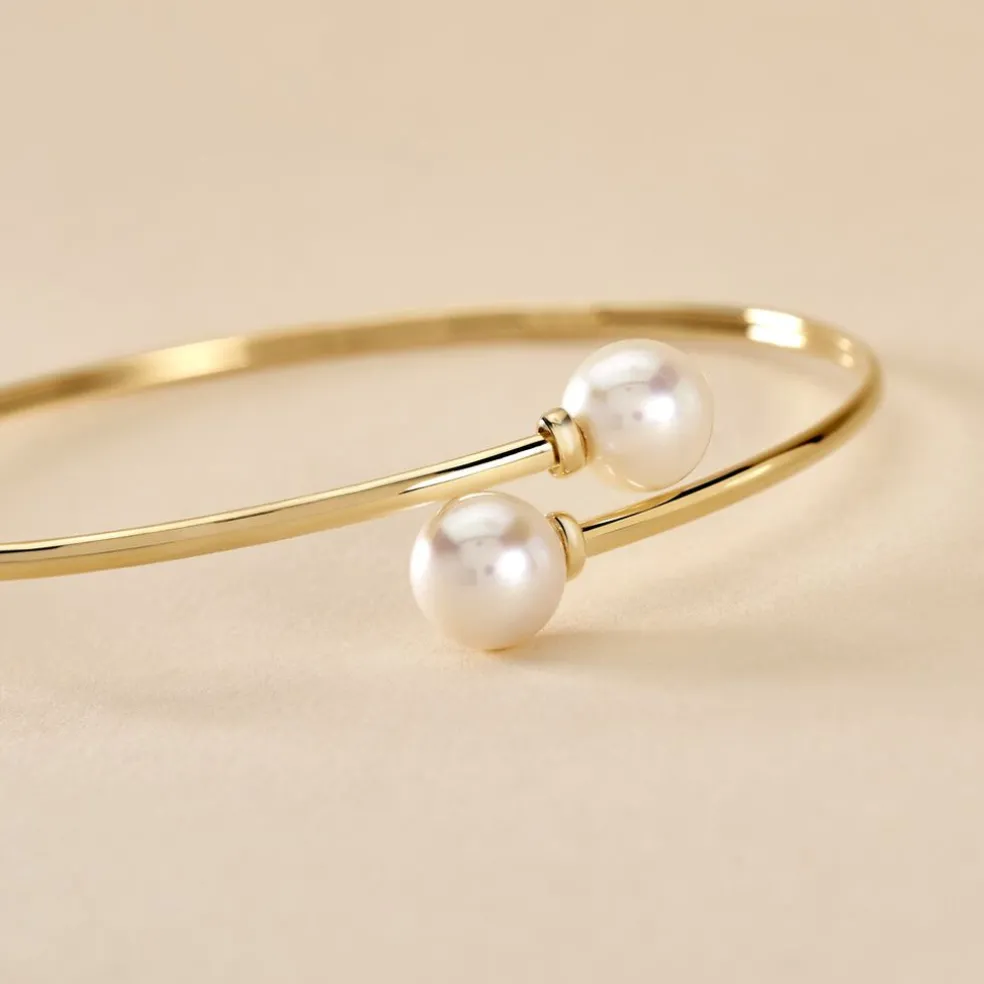 Bracelet Or Jaune 375/1000 Jonc Flexible Avec Double Perles De Culture Blanches