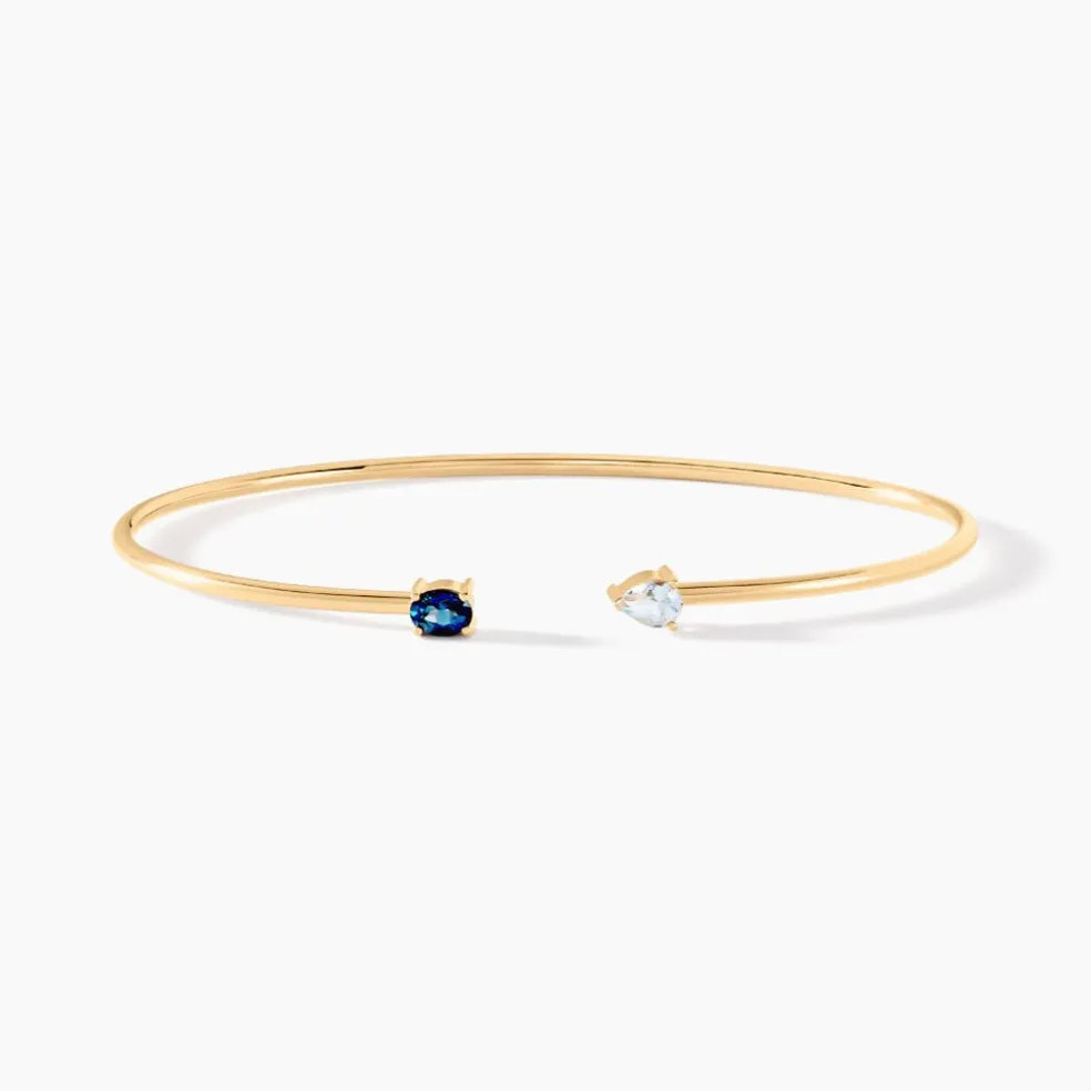 Jonc Or Jaune 375/1000 Ouvert Flexible Topazes Bleu London Poire Et Bleu Sky Ovale Serti Griffes