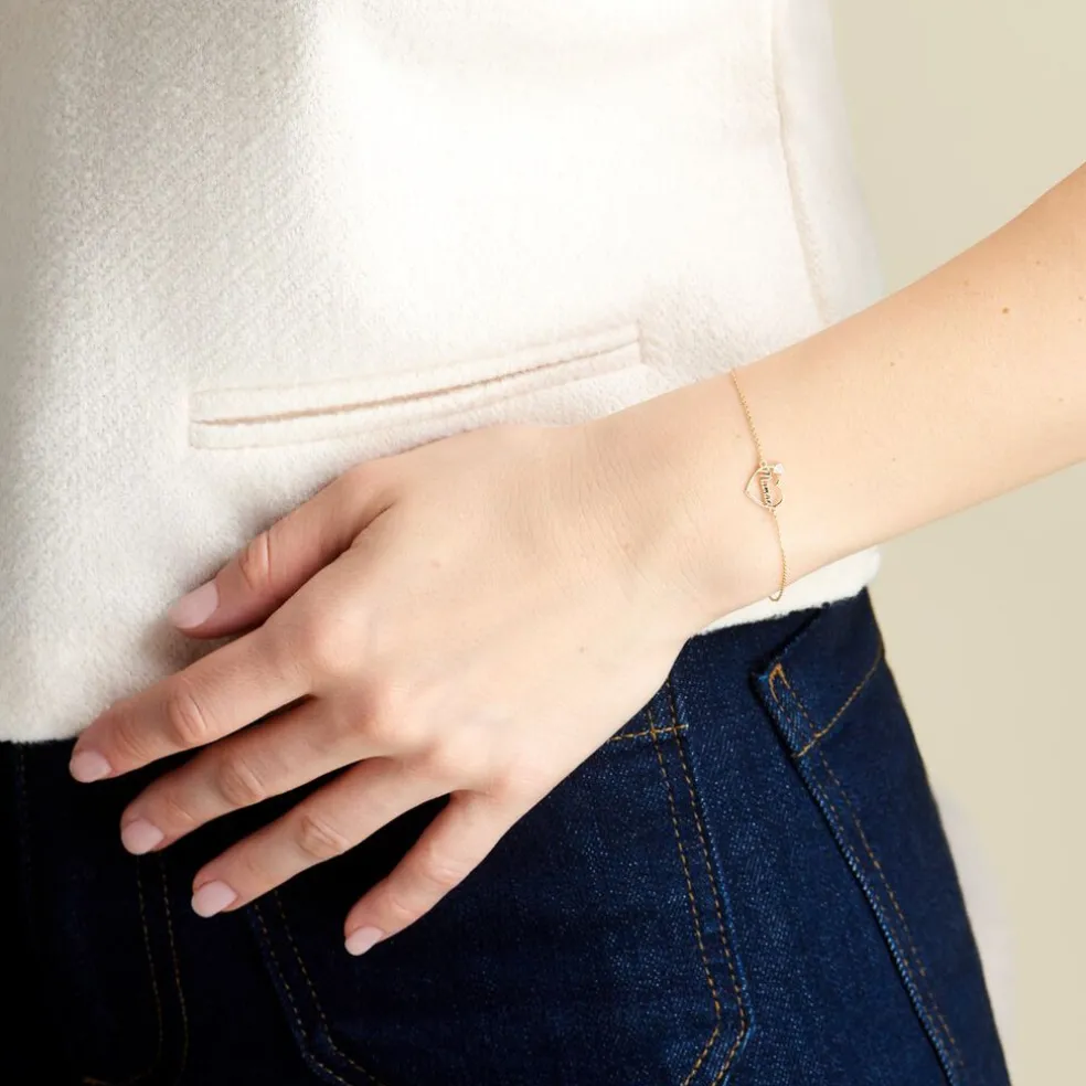 Bracelet Or Jaune 375/1000 Coeur Ajoure Ecriture Maman + Petit Coeur Plein Glitter Argente Maille Jaseron 16+2cm