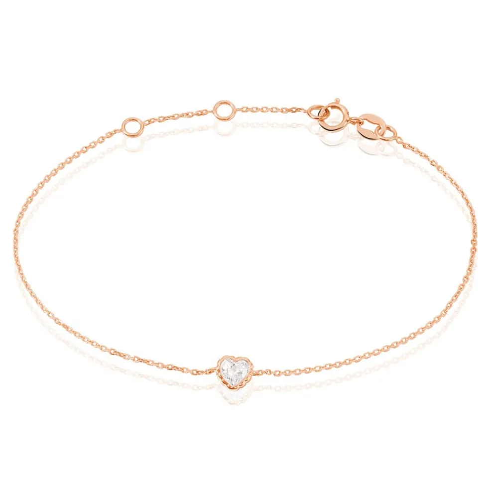 Bracelet Or Rose 375/1000 Solitaire Forme C艙ur Oxyde De Zirconium Serti Clos 17cm