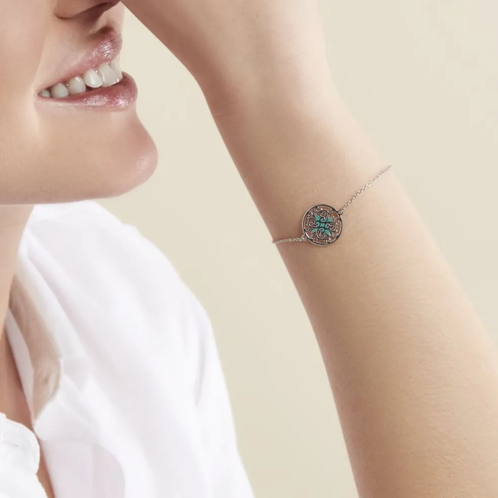 Bracelet Argent 925/1000 Rosace Email Turquoise Maille Forçat 19cm