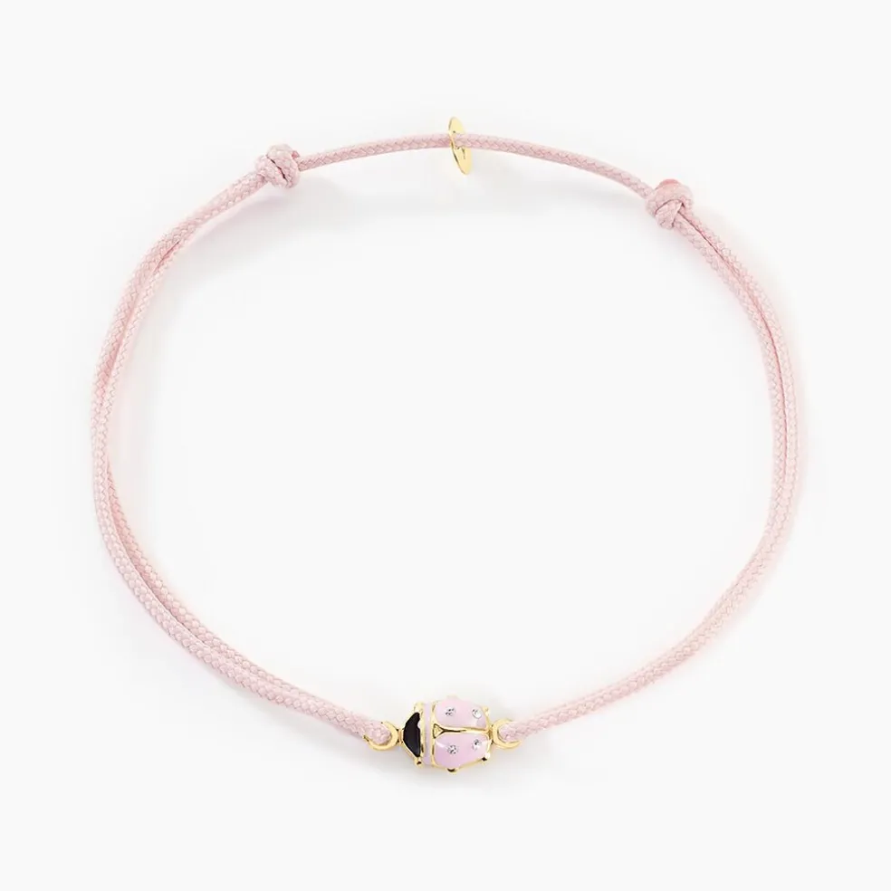 Bracelet Or Jaune 375/1000 Coccinelle Rose Oxydes De Zirconium Cordon Coton Rose Ajustable
