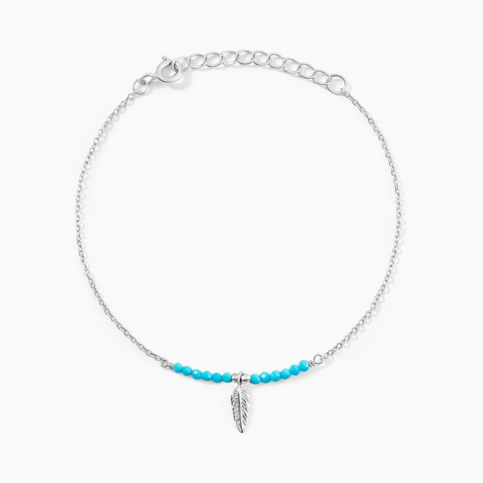 Bracelet Argent Blanc 925/1000 Feuille Et Boules Turquoises Maille Jaseron 17+3cm