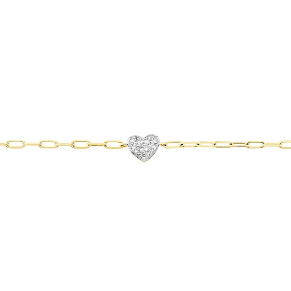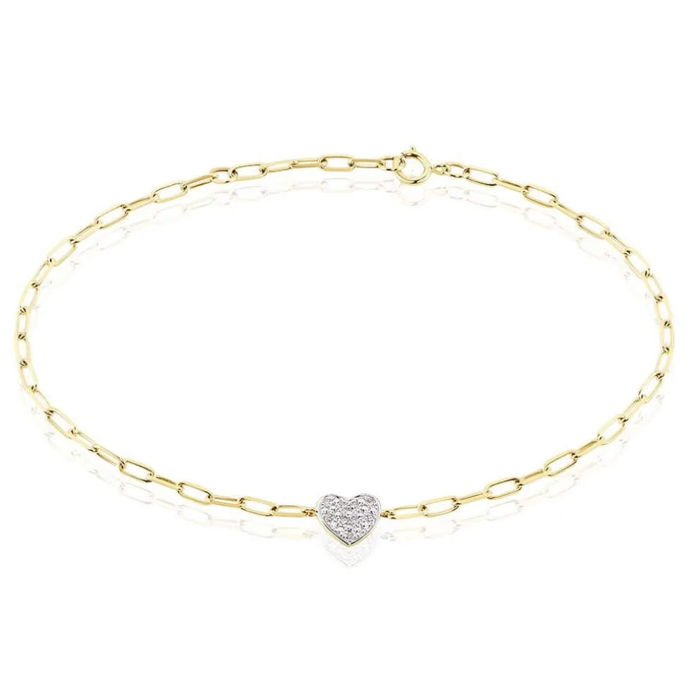 Bracelet Or Jaune 375/1000 Motif Coeur Diamants 0.0243cts Maille Cheval 16+2cm