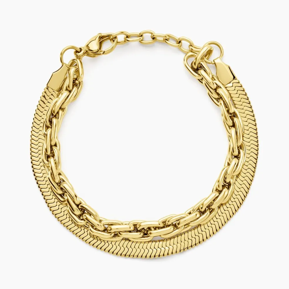 Bracelet Acier Inoxydable Jaune Double Rang Mailles Miroir Et Tresse Largeur 5mm 16+3cm