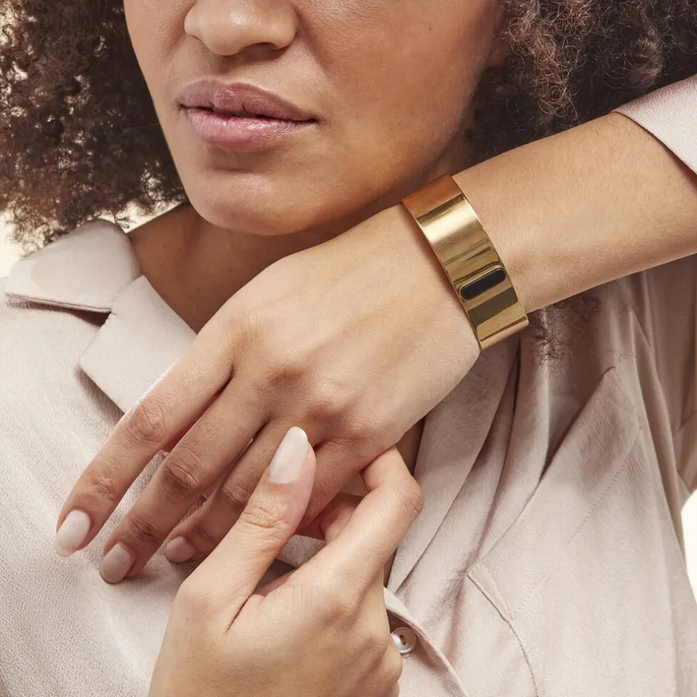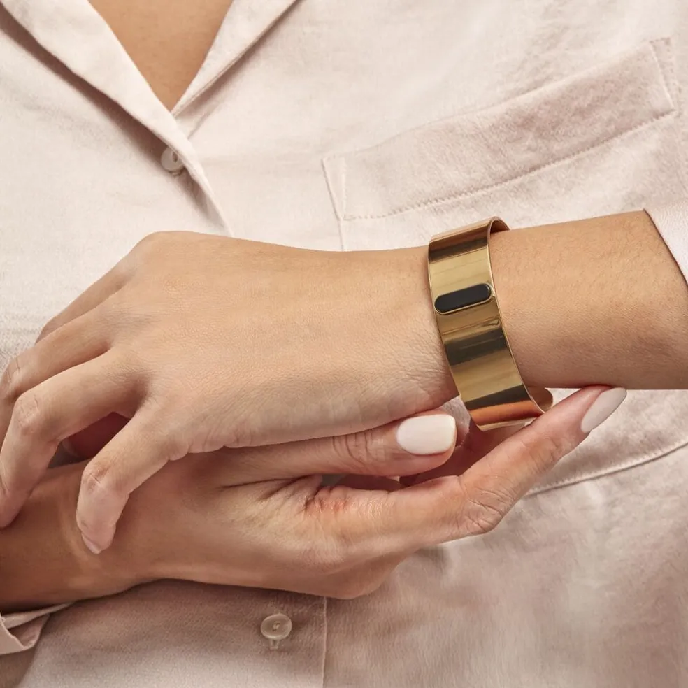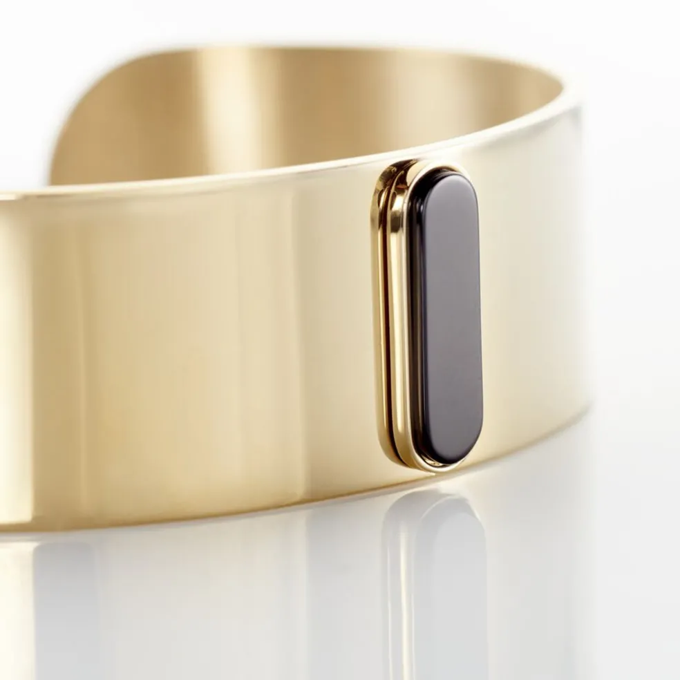 Bracelet Manchette Acier Dore Barrette Agate Noire Diametre 60mm