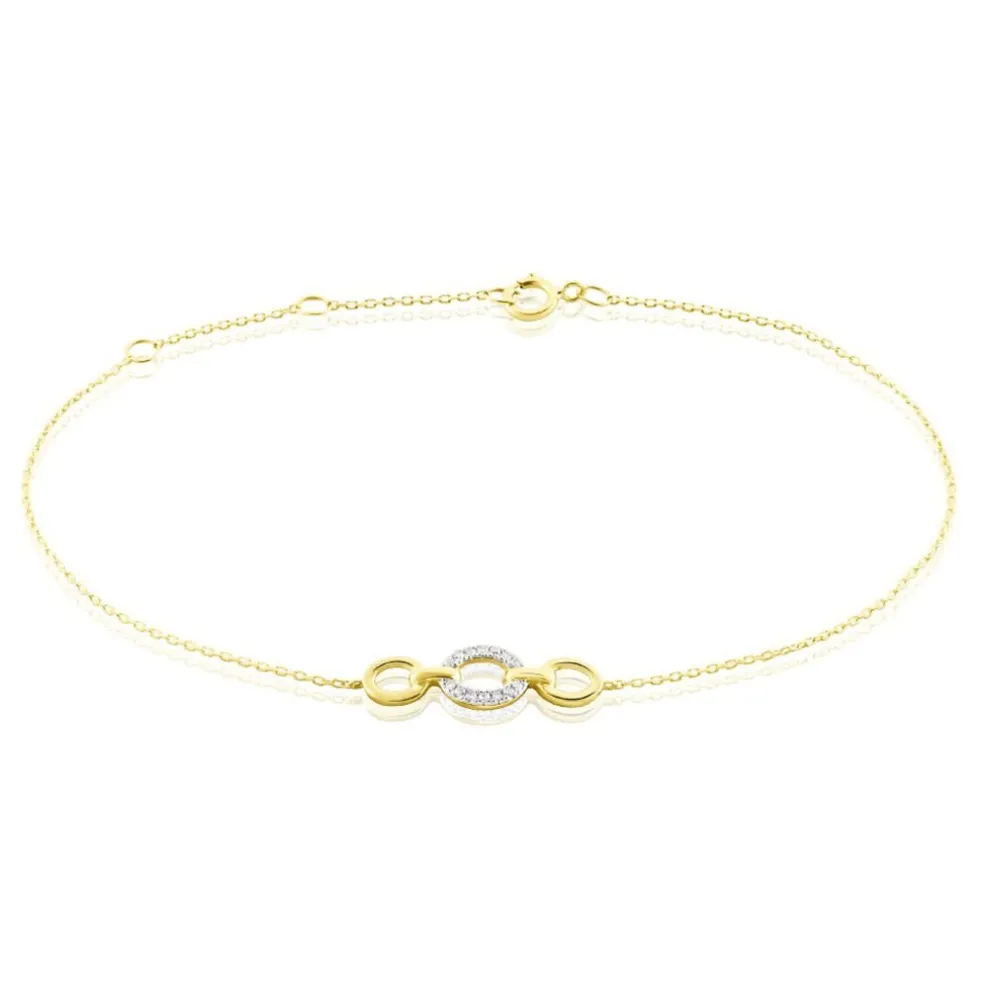 Bracelet Or Jaune 375/1000 Forme Triple Cercle Pavage Diamants Maille Forçat 18cm