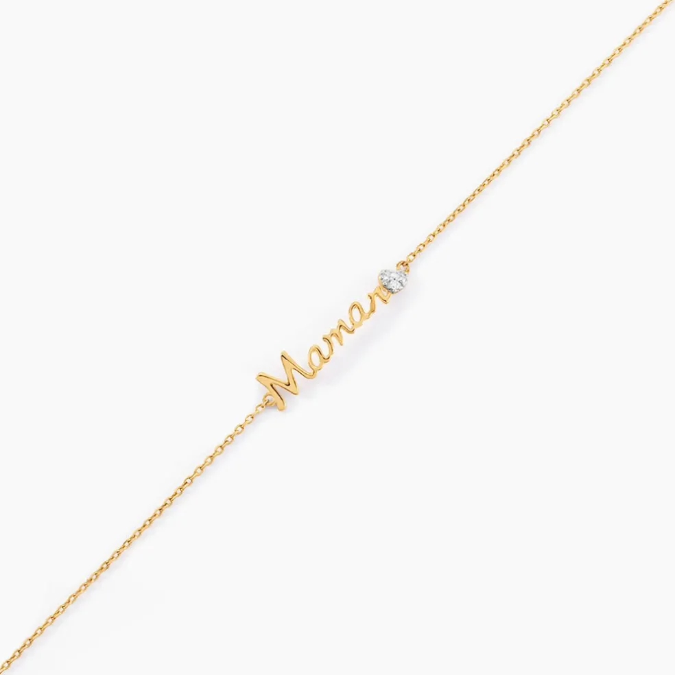 Bracelet Or Jaune 375/1000 Message Maman Pavage Diamant Maille Forcat 16+2cm