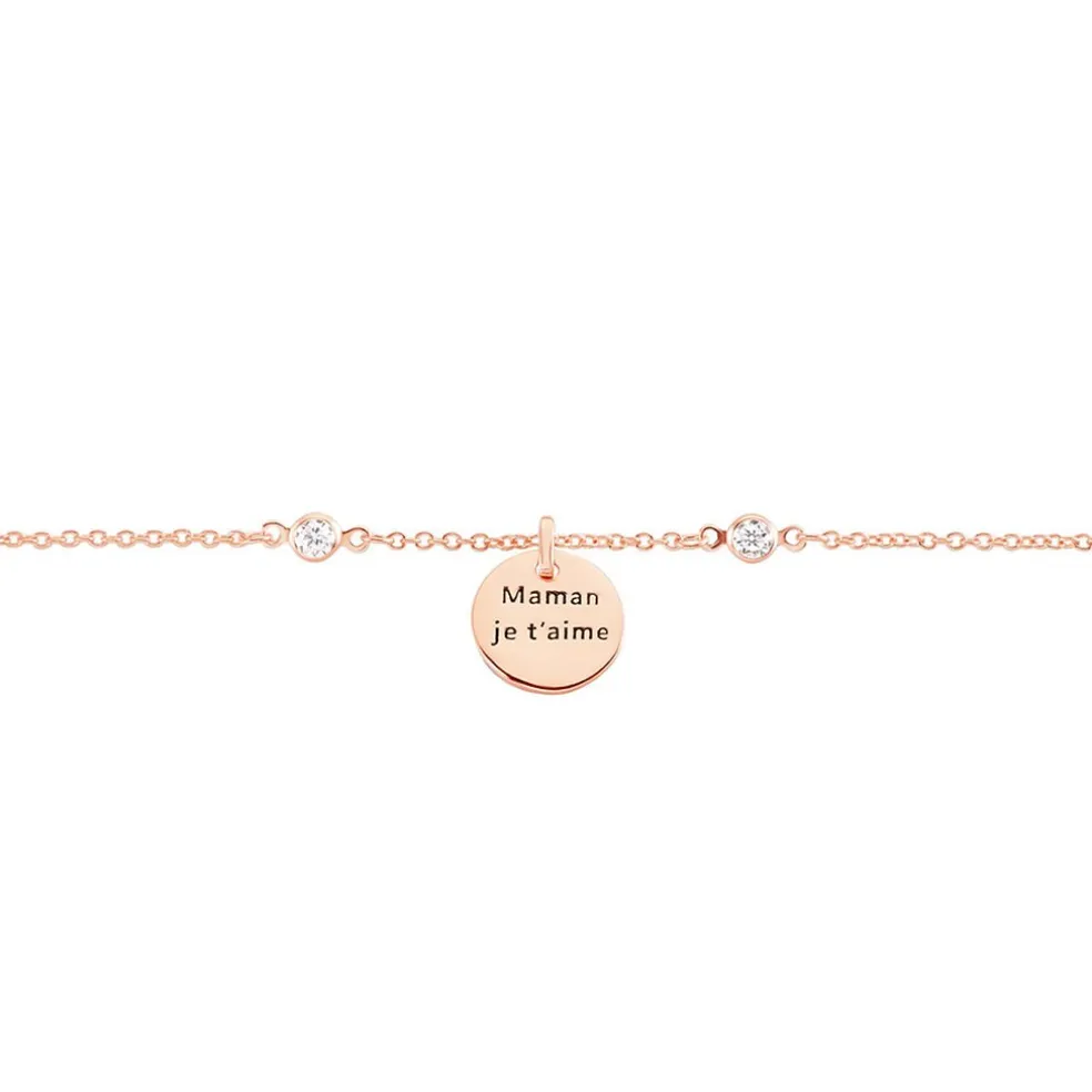 Bracelet Argent Rose 925/1000 Pastille Gravée Maman Je T’aime Oxydes De Zirconium Maille Forçat 16+3cm