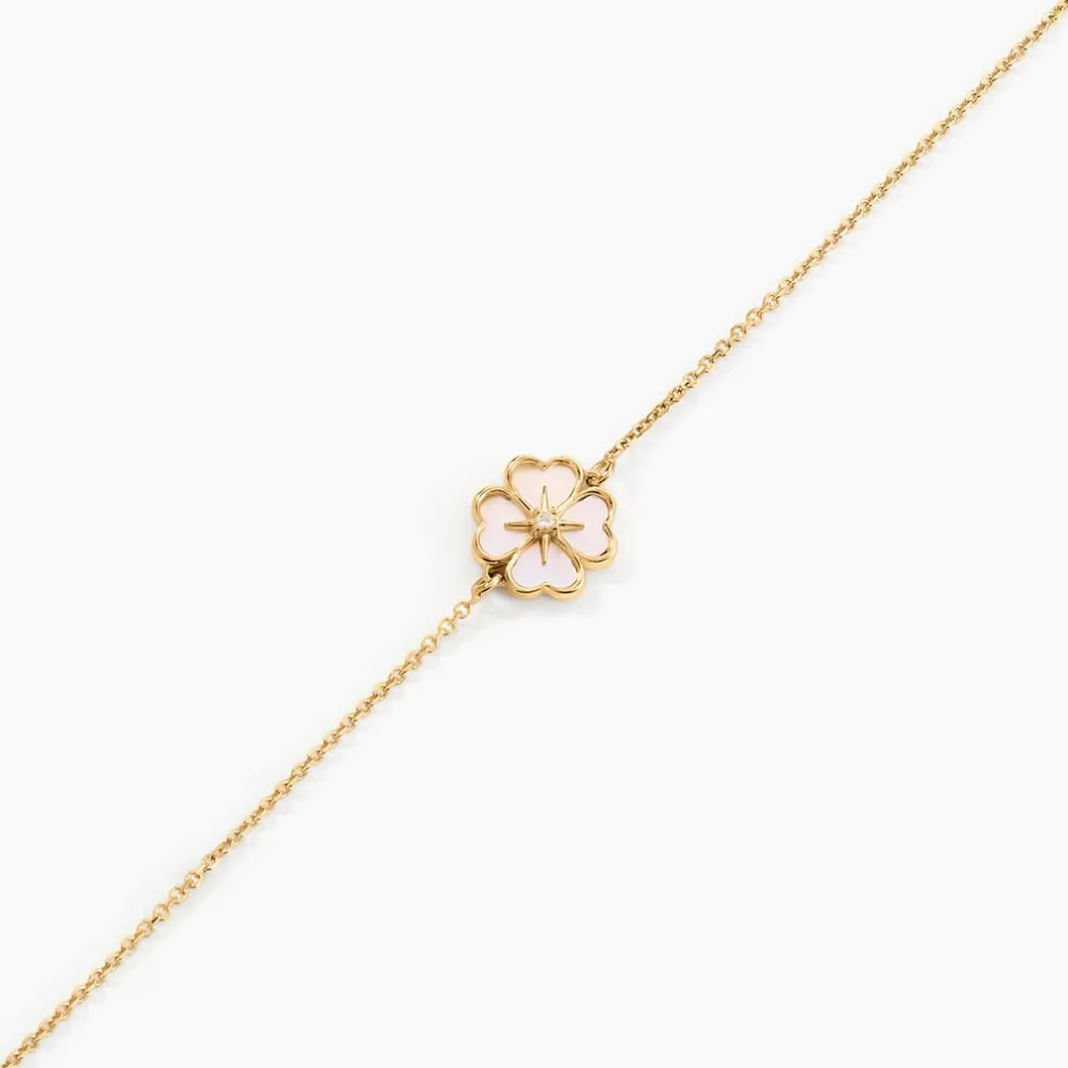 Bracelet Or Jaune 375/1000 Fleur De Trefle Nacre Blanche 1 Oxyde De Zirconium Serti 4 Griffes Maille Jaseron 16+2cm