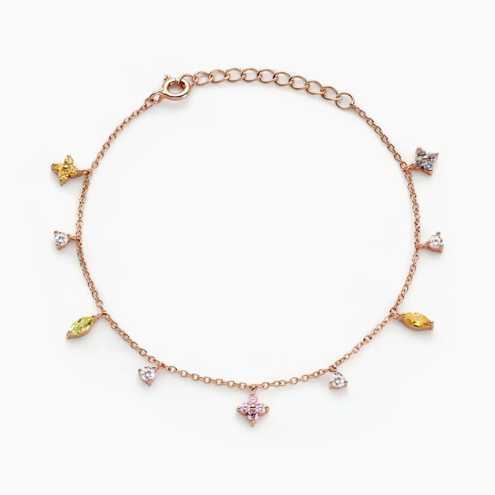 Bracelet Argent Rose 925/1000 Pampilles Fleurs Oxydes De Zirconium Multicolores Serti Griffes Maille Forçat 16+3cm