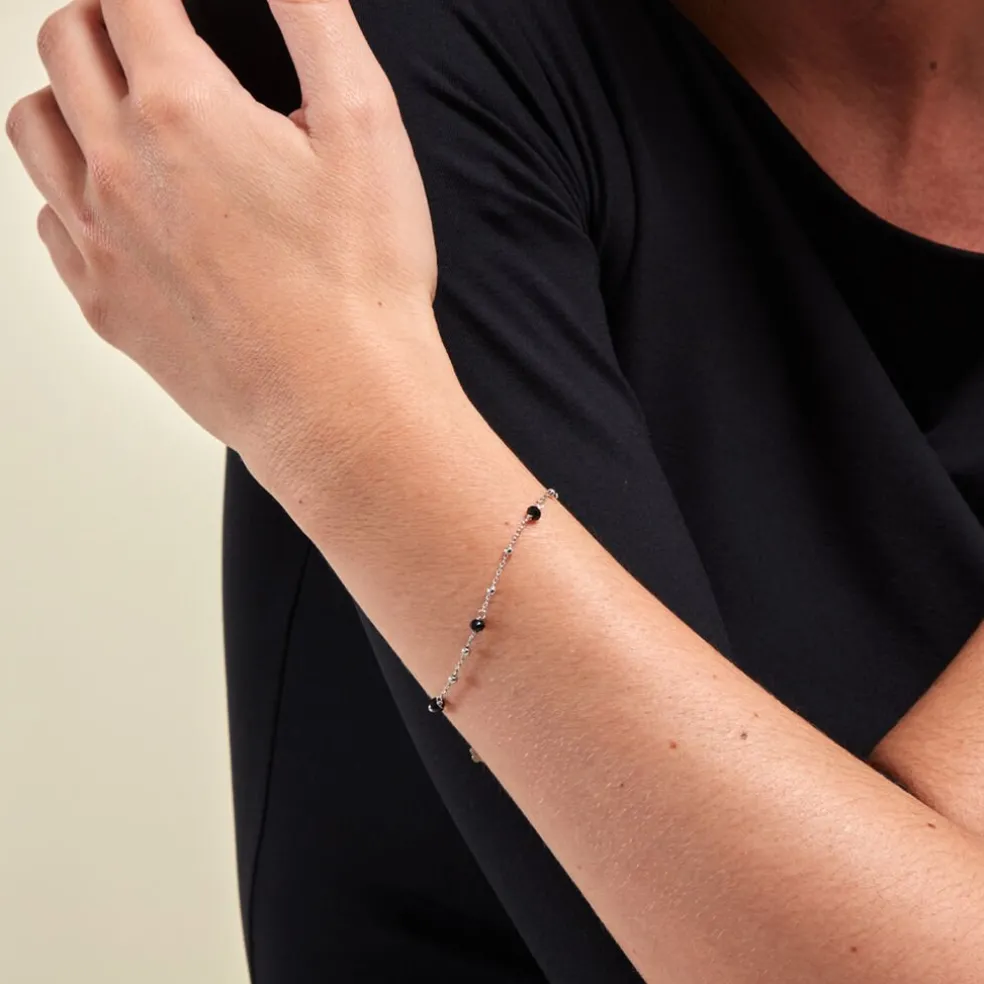 Bracelet Argent Blanc 925/1000 Boules Verre Noir Maille Boules 16+3cm
