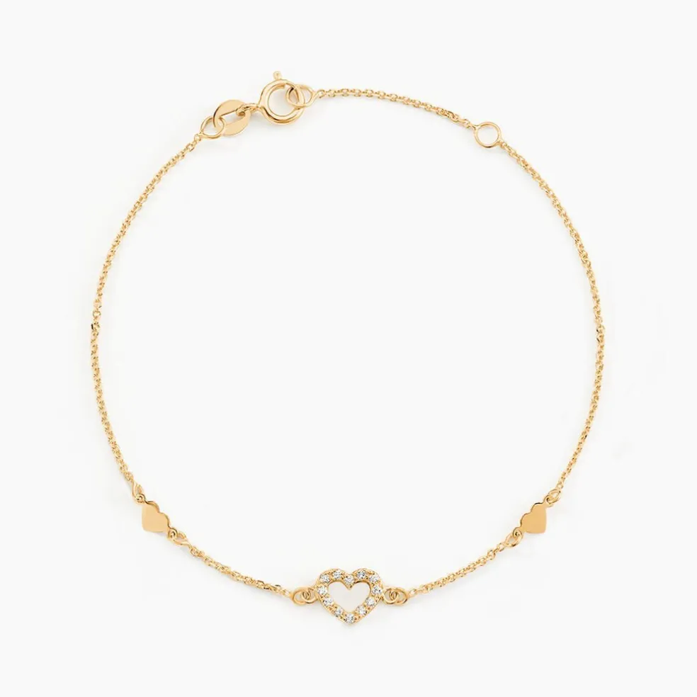 Bracelet Or Jaune 375/1000 C艙ur Ajoure Oxydes De Zirconium Et Double C艙urs Pleins 18cm
