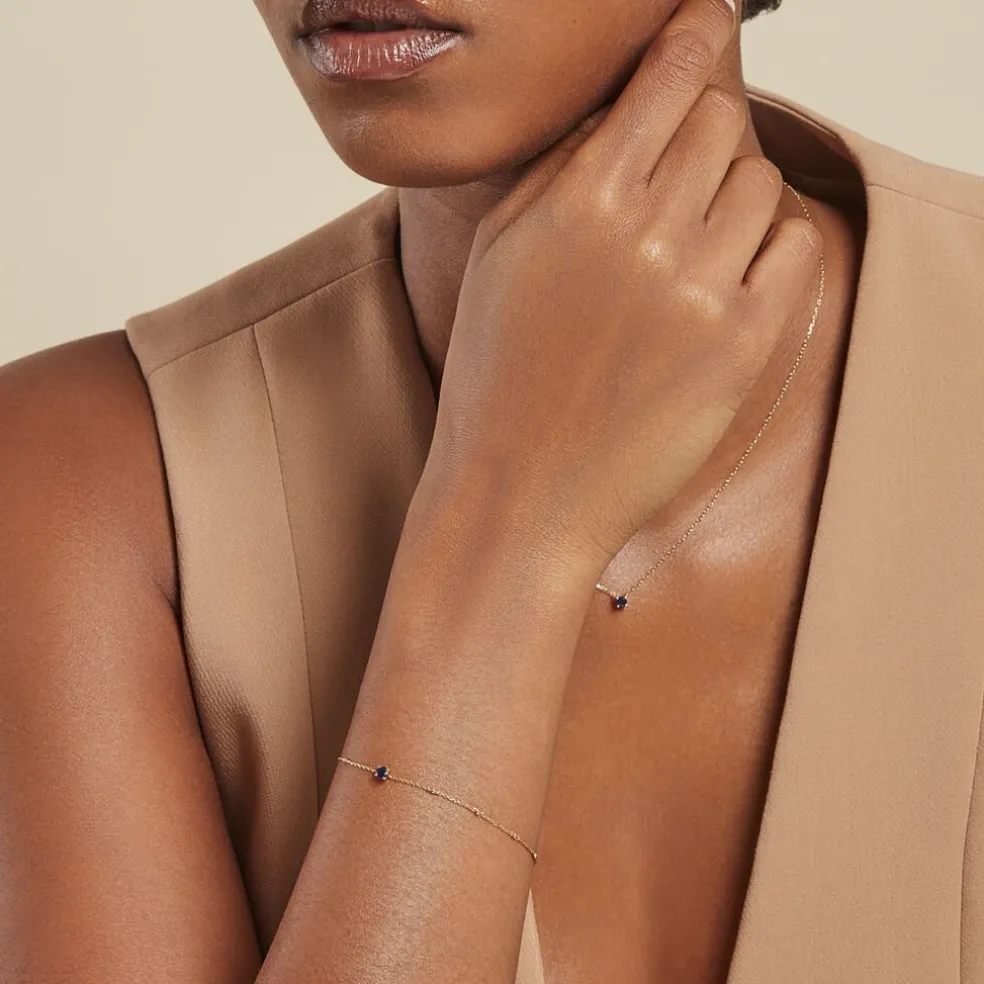 Bracelet Or Jaune 375/1000 Saphir Ronde 0.14cts Serti Griffes Maille Boule Forcat 16+2cm