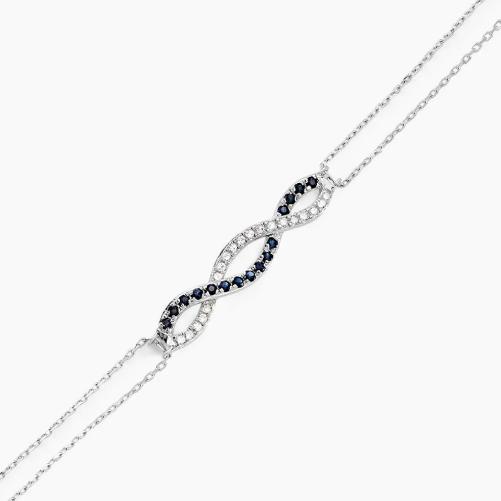 Bracelet Or Blanc 375/1000 Forme Vagues Maille Forçat Pavage Saphirs Bleu 0.09cts Et Diamants Double Chaine 18.5cm