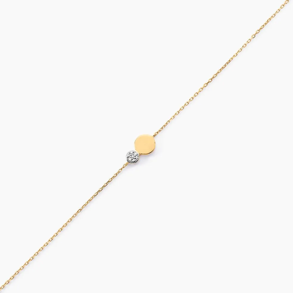 Bracelet Or Jaune 375/1000 Pastille Pleine Et Pastille Pavage Diamants Maille Forcat 16+2cm