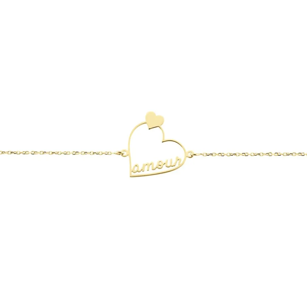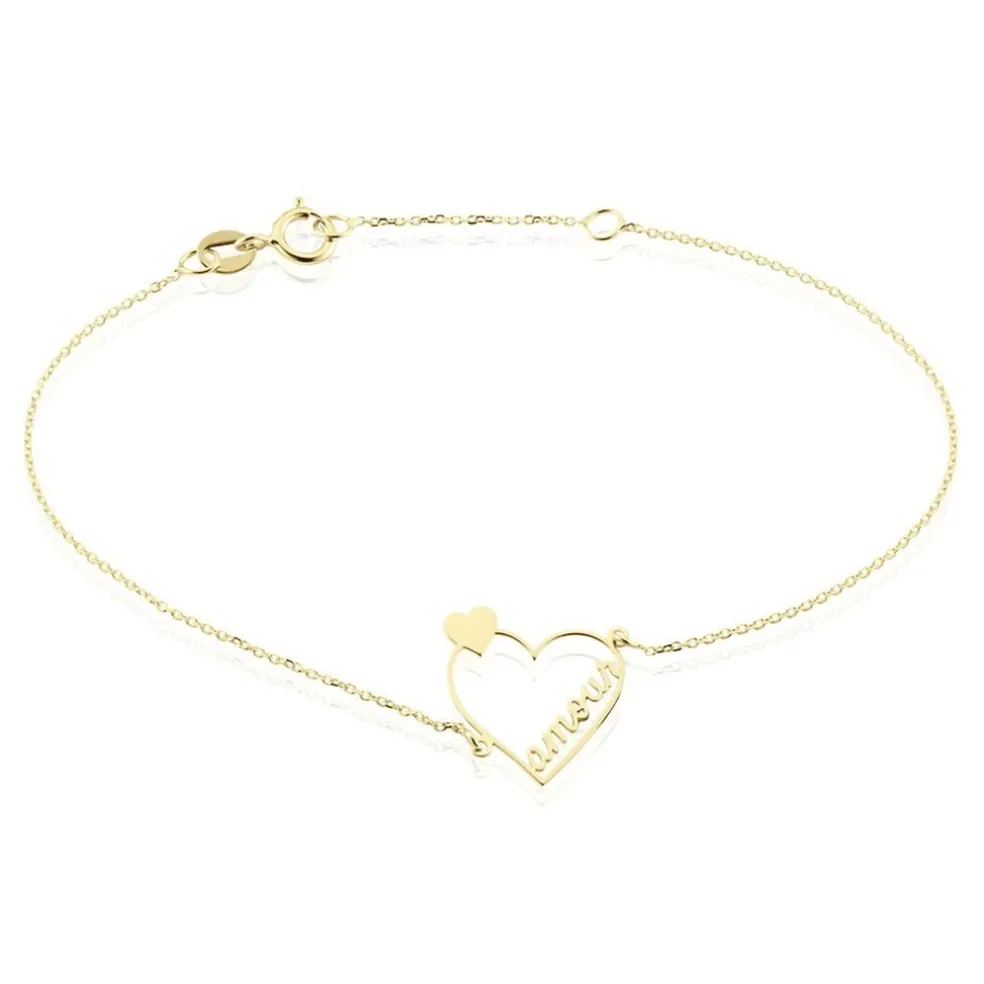 Bracelet Or Jaune 375/1000 Grand C艙ur Ajoure Et Petit C艙ur Plein + Message Amour Maille Jaseron 16+2cm