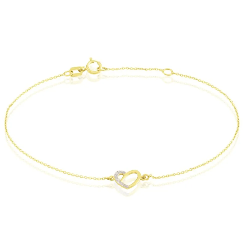 Bracelet Or Jaune 375/1000 Coeur Ajoure Glitter Argente Maille Jaseron 16+2cm